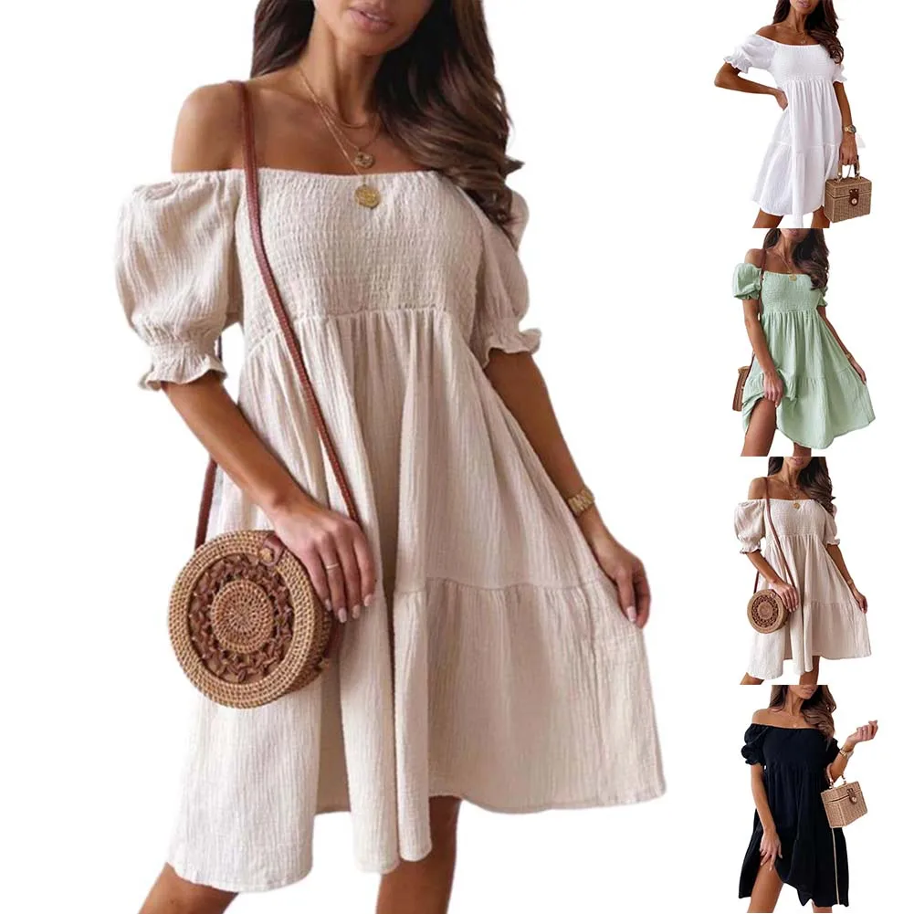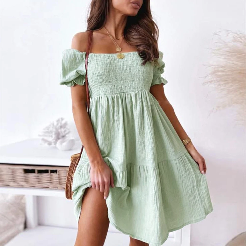 New Short Sleeve Off The Shoulder High Waist A-Line Pleated Dress Sexy Club Outfits Solid Color Summer Dress Women 2025