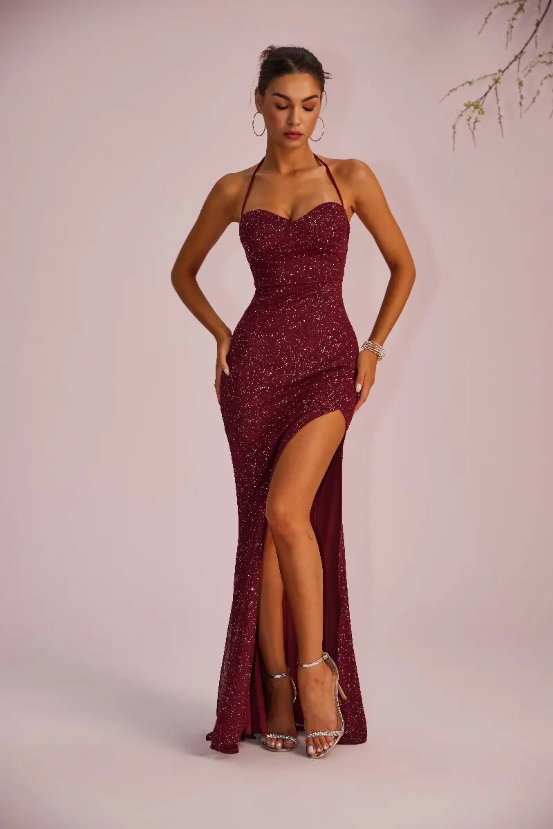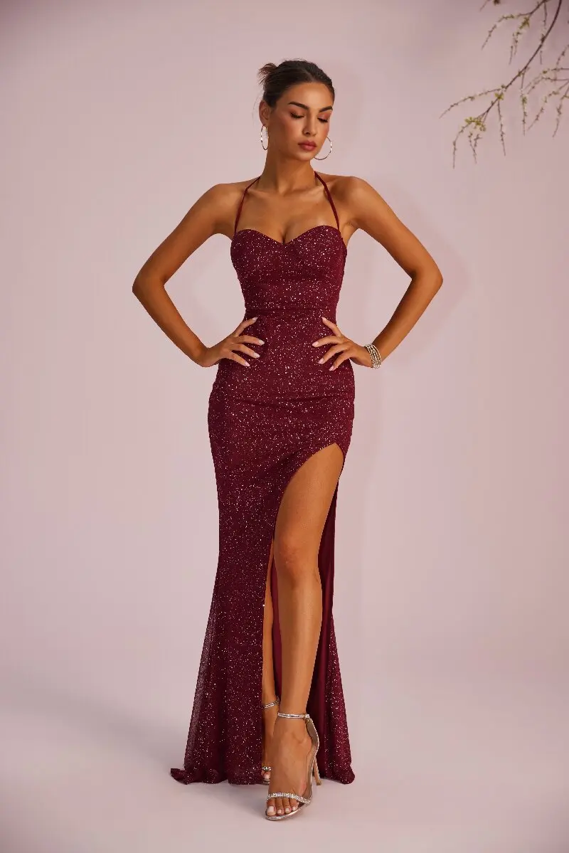 New wine red sequin fabric evening dress with no sleeves, tied straps, high slit, strapless style, essential for parties