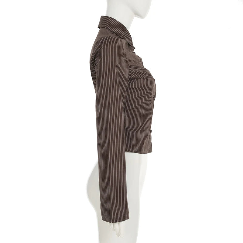New Women Striped Shirt Casual Turn Down Collar Flare Sleeve Slim Fit Button Up Blouse Minimalist Aesthetic