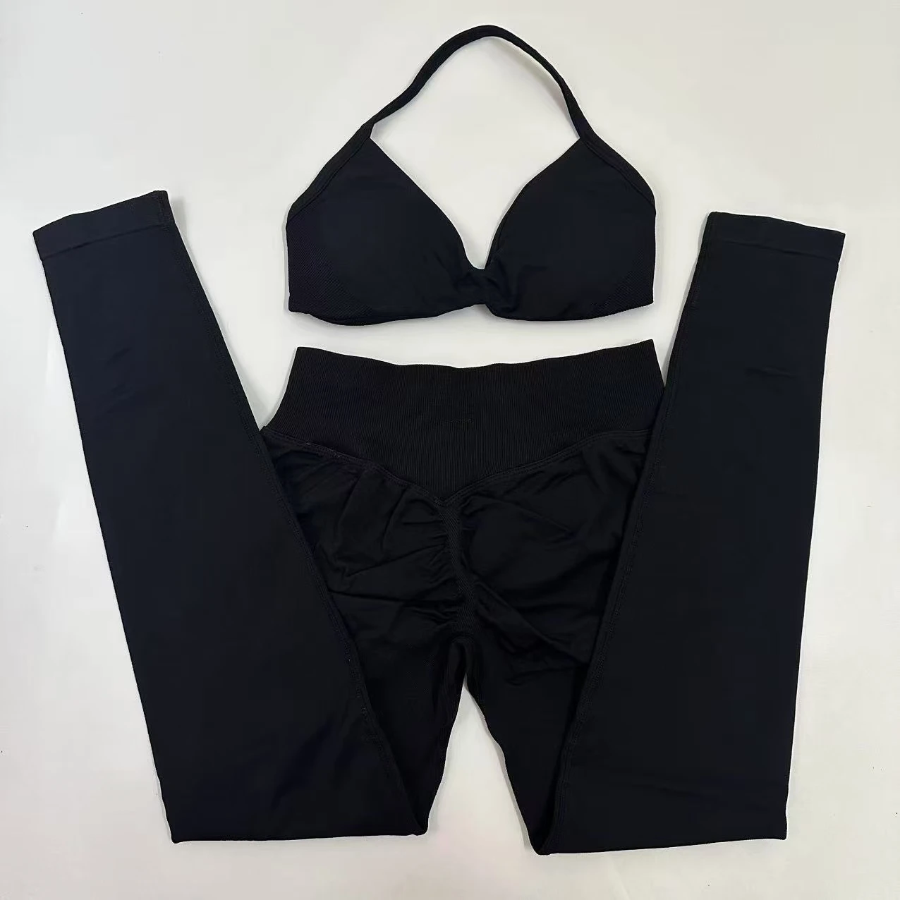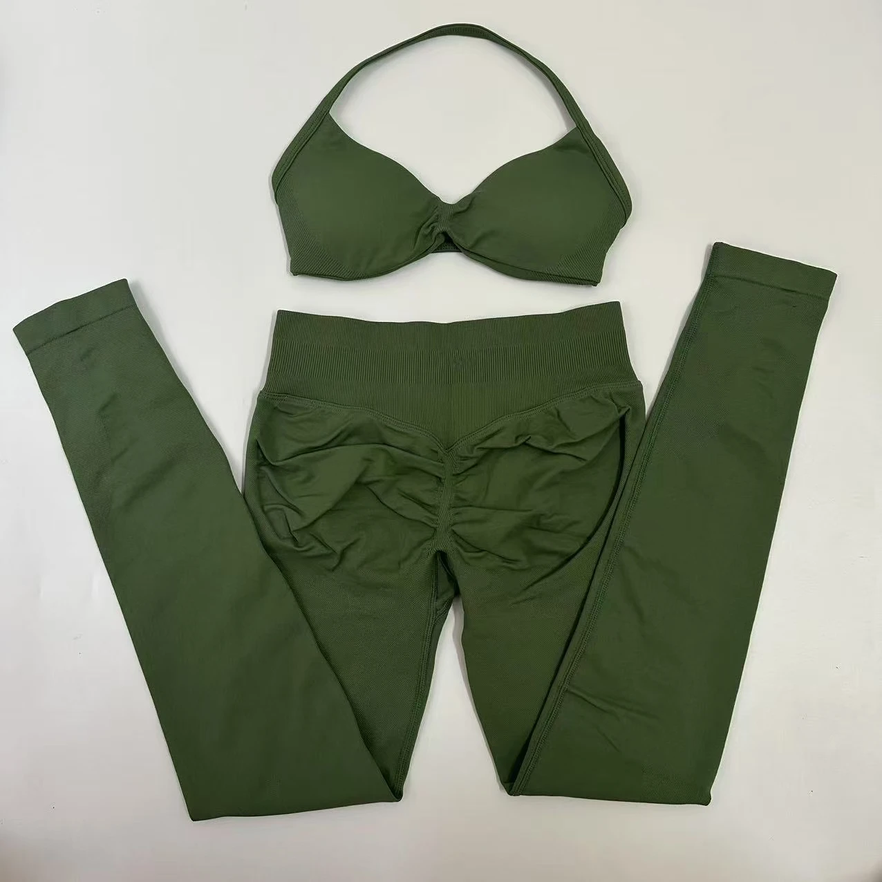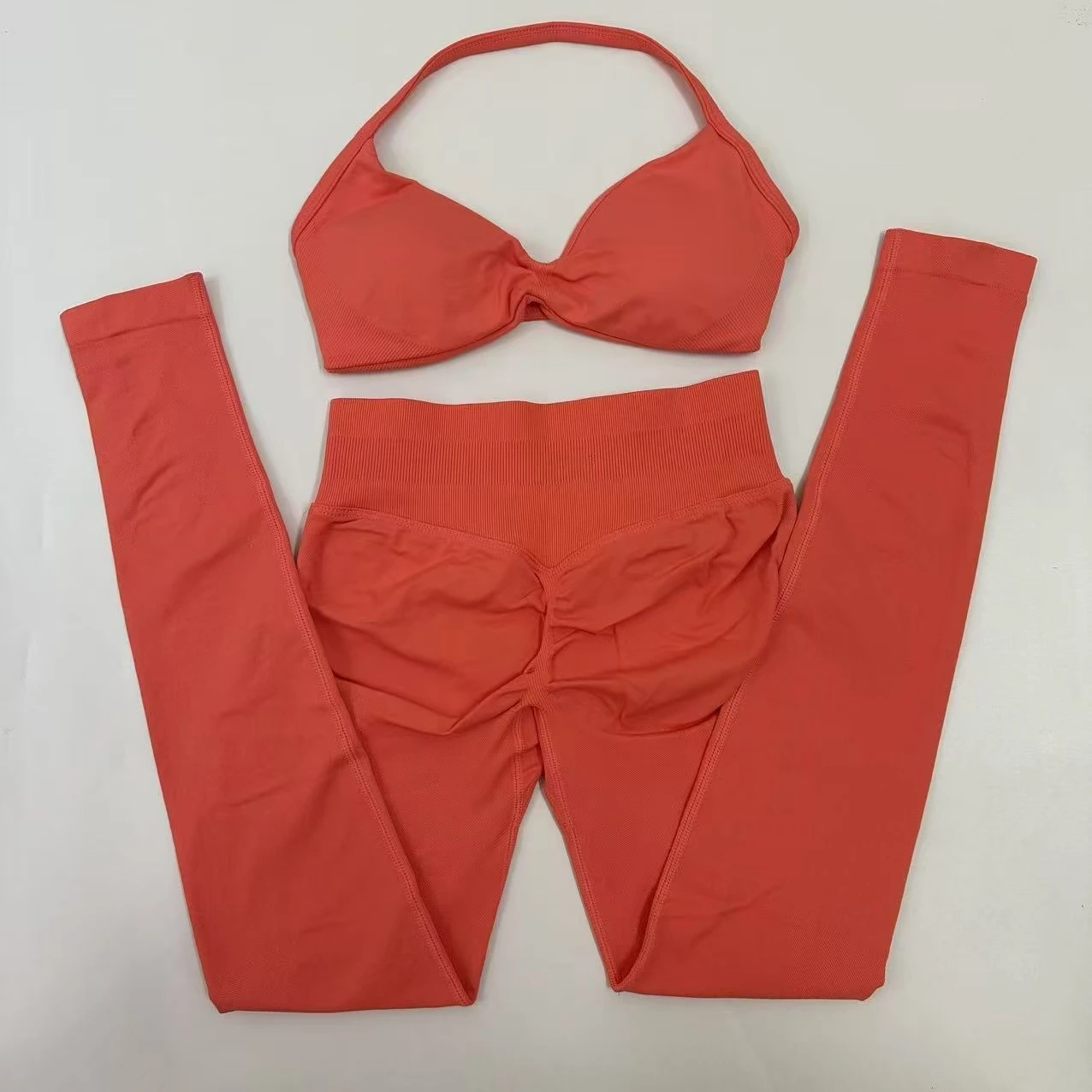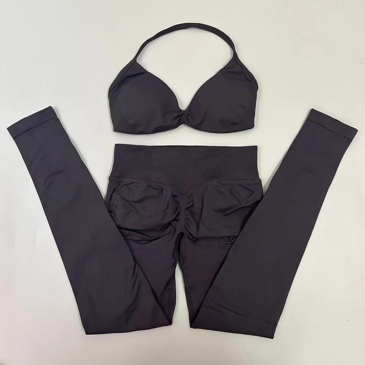 No Logo Seamless Yoga Set Women Workout Scrunch Leggings Set Strappy Halter Sports Bra Fitness Gym Clothing Workout Set 2 Pieces