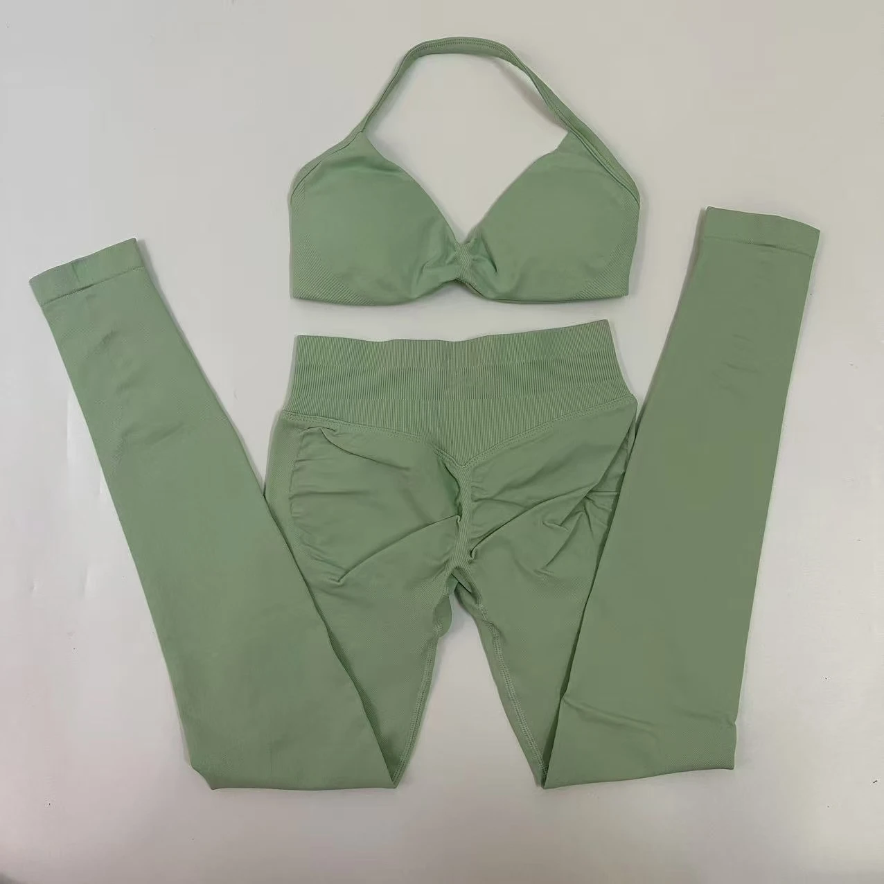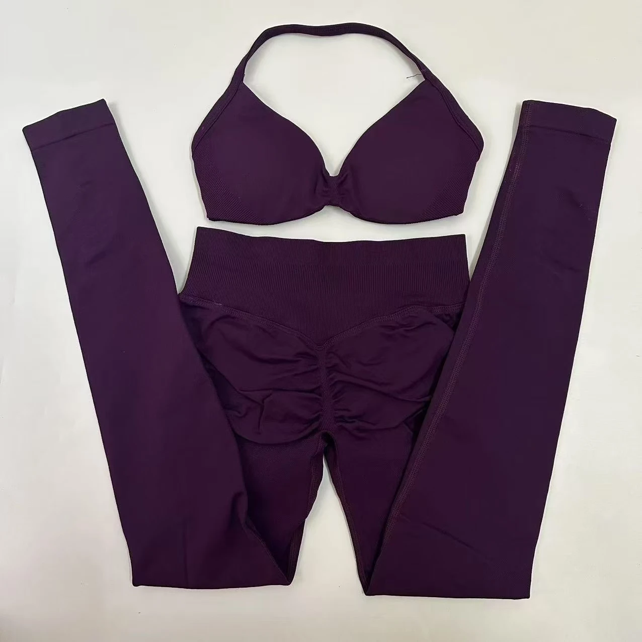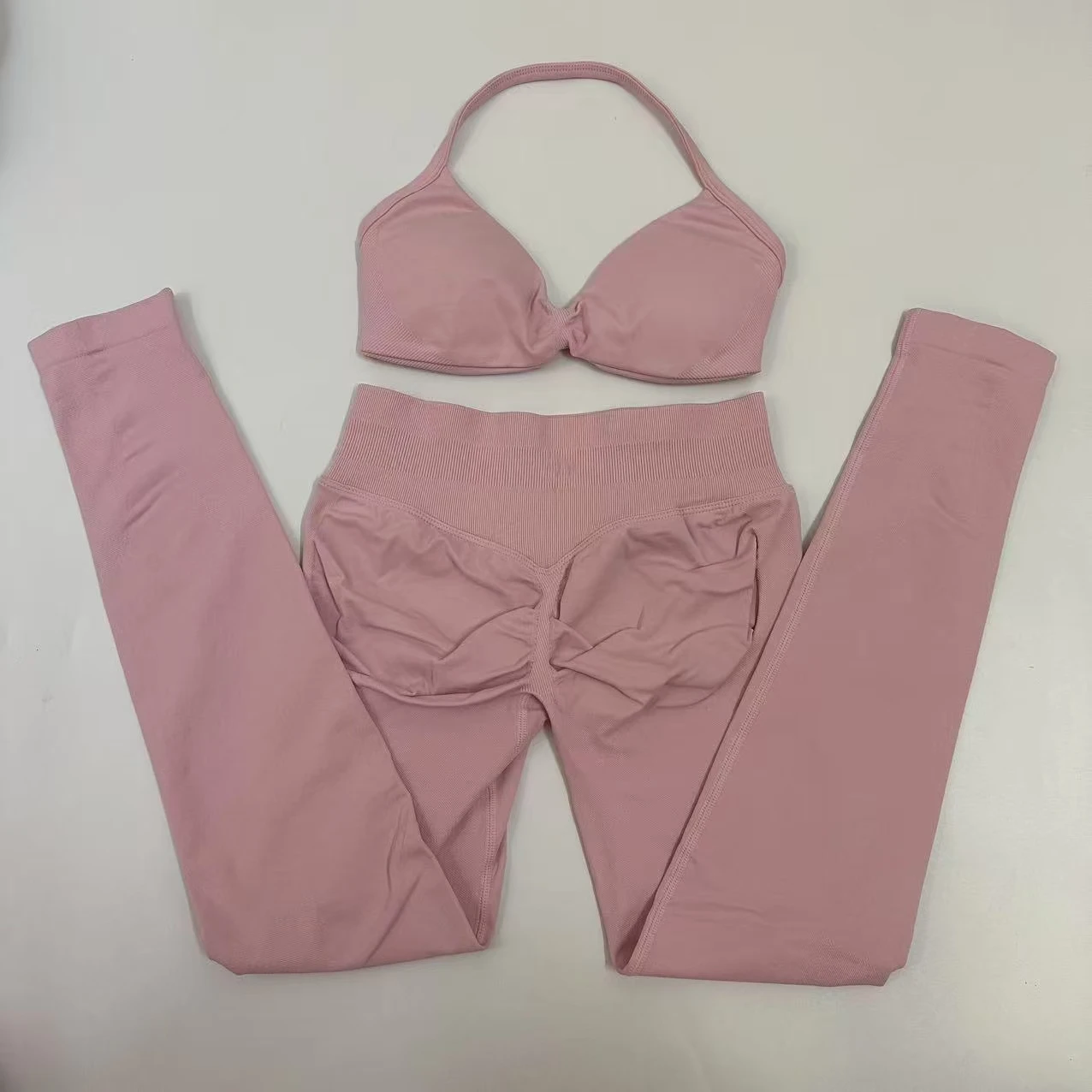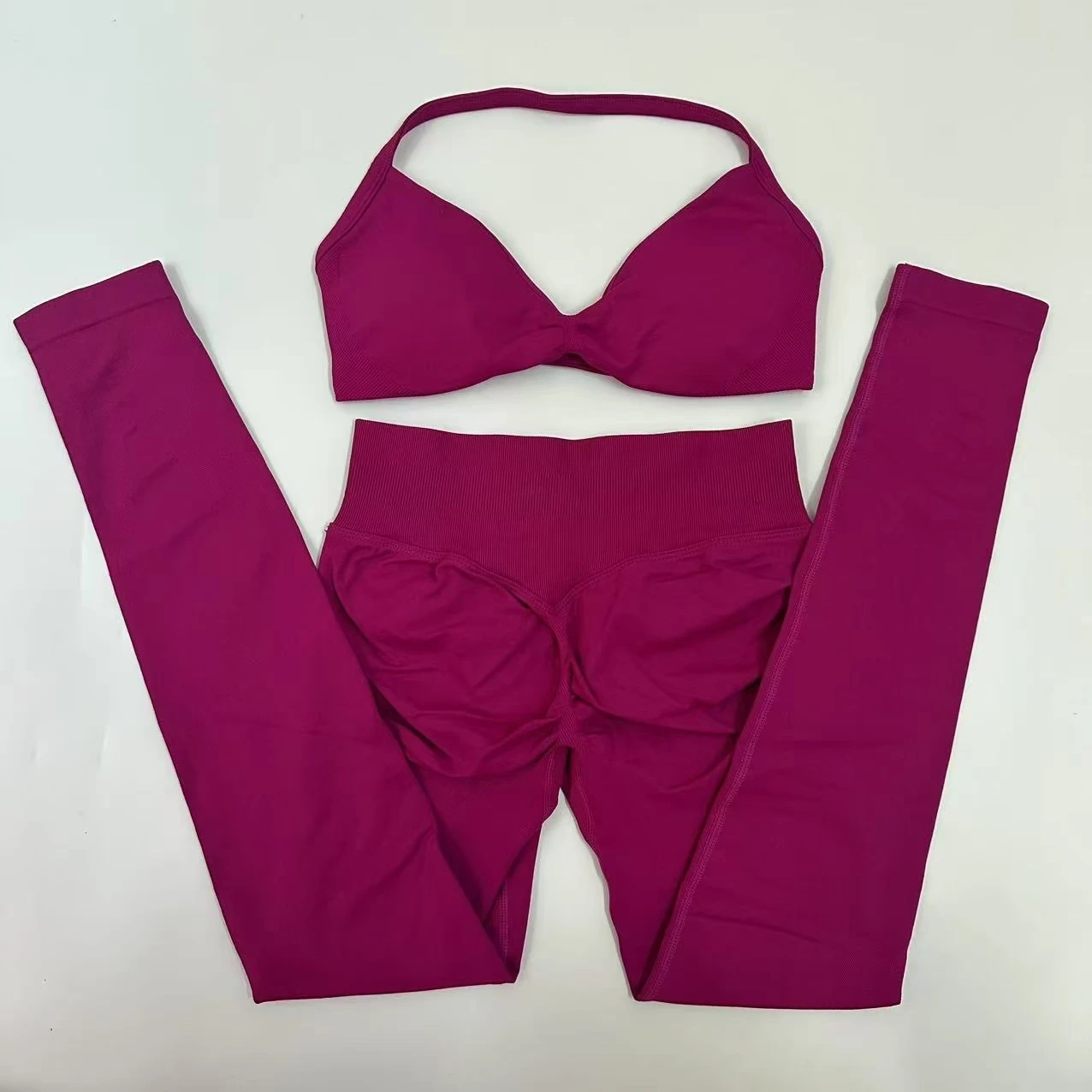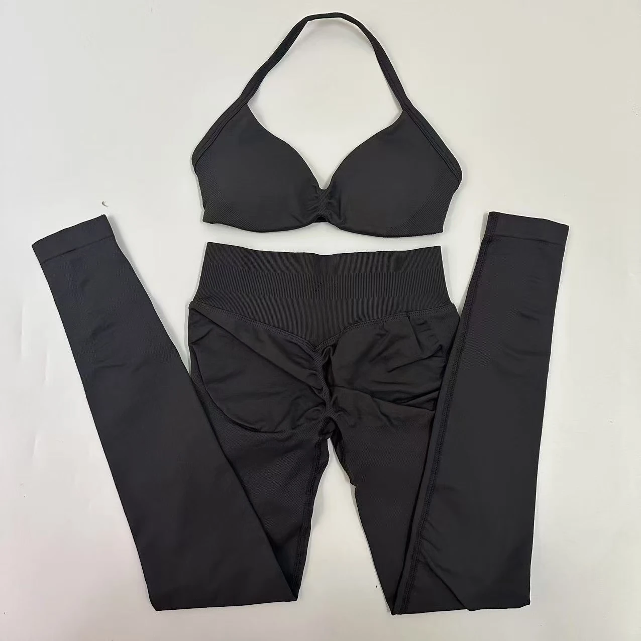 No Logo Seamless Yoga Set Women Workout Scrunch Leggings Set Strappy Halter Sports Bra Fitness Gym Clothing Workout Set 2 Pieces