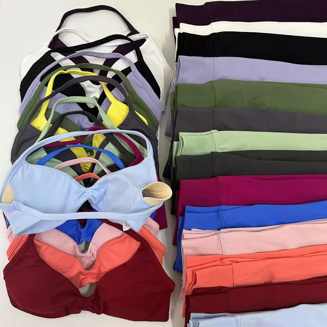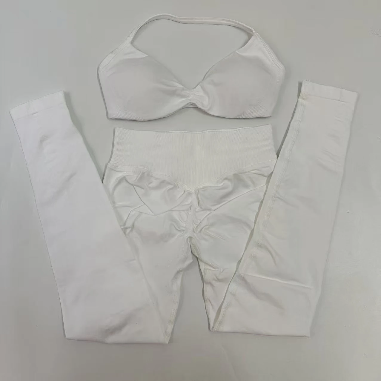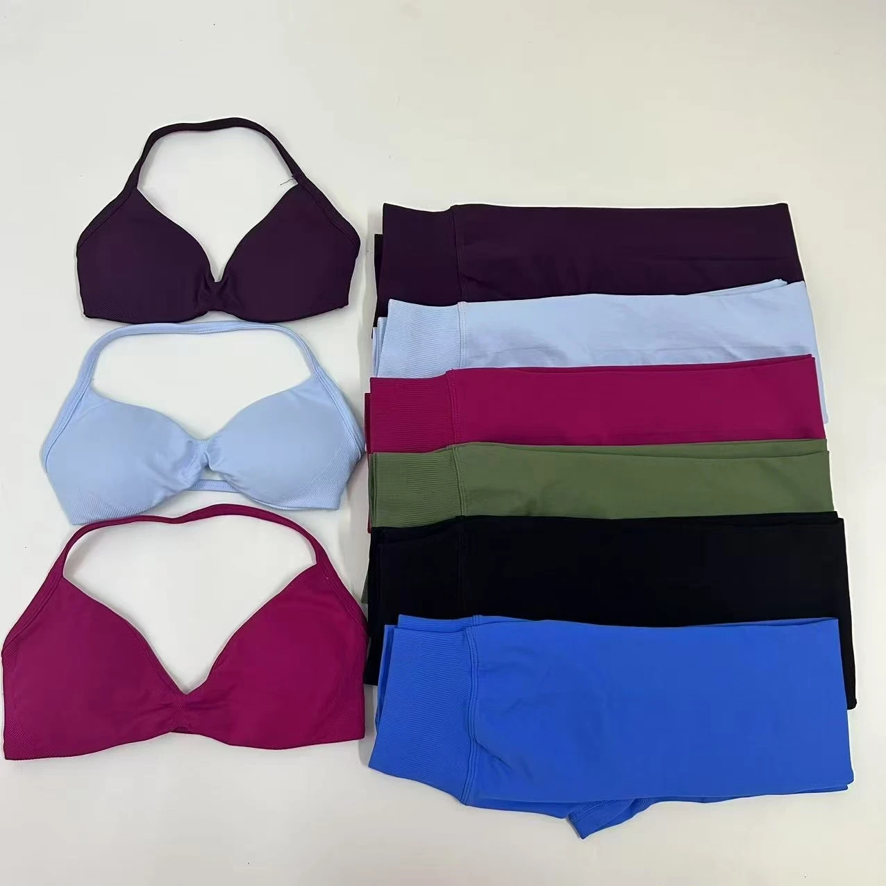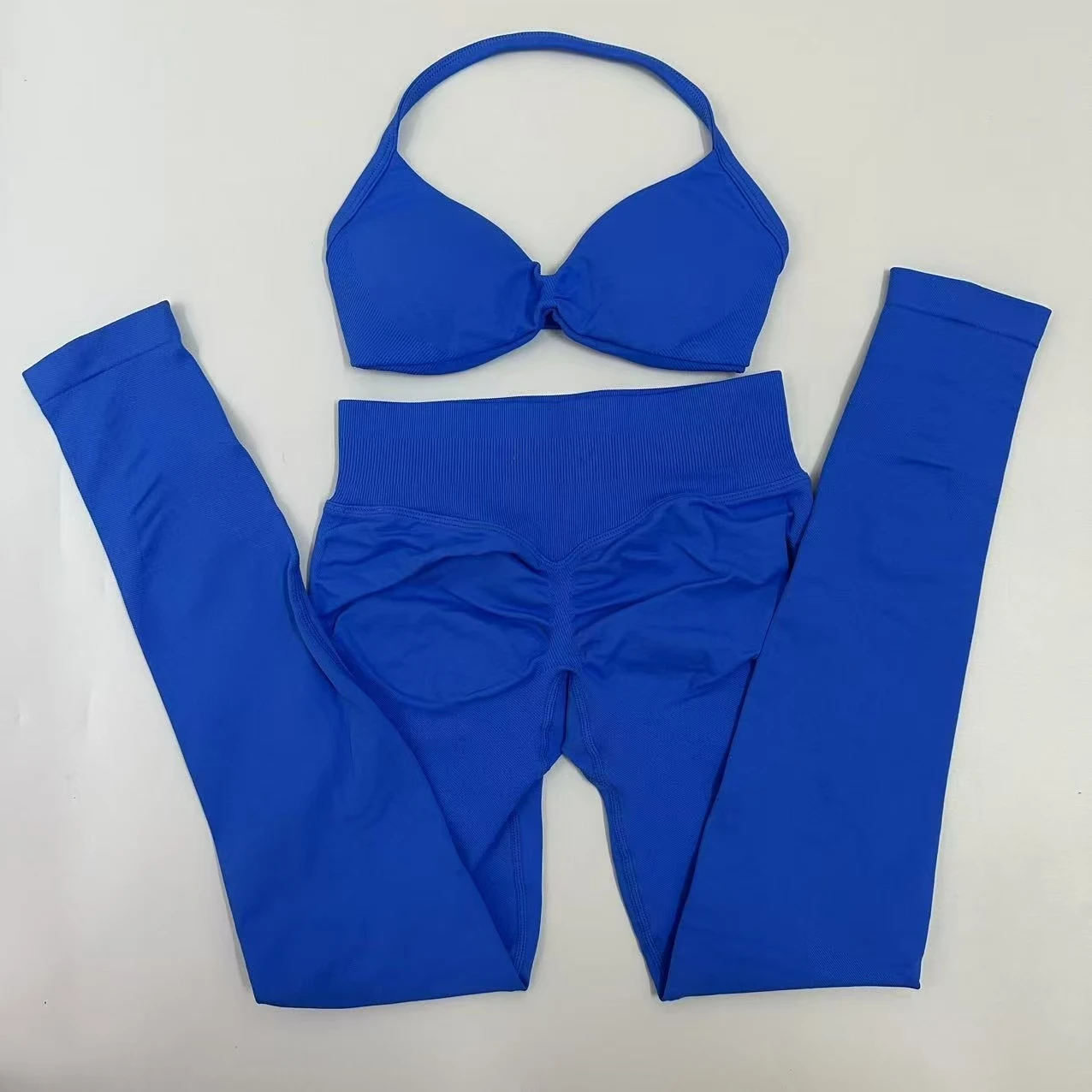 No Logo Seamless Yoga Set Women Workout Scrunch Leggings Set Strappy Halter Sports Bra Fitness Gym Clothing Workout Set 2 Pieces