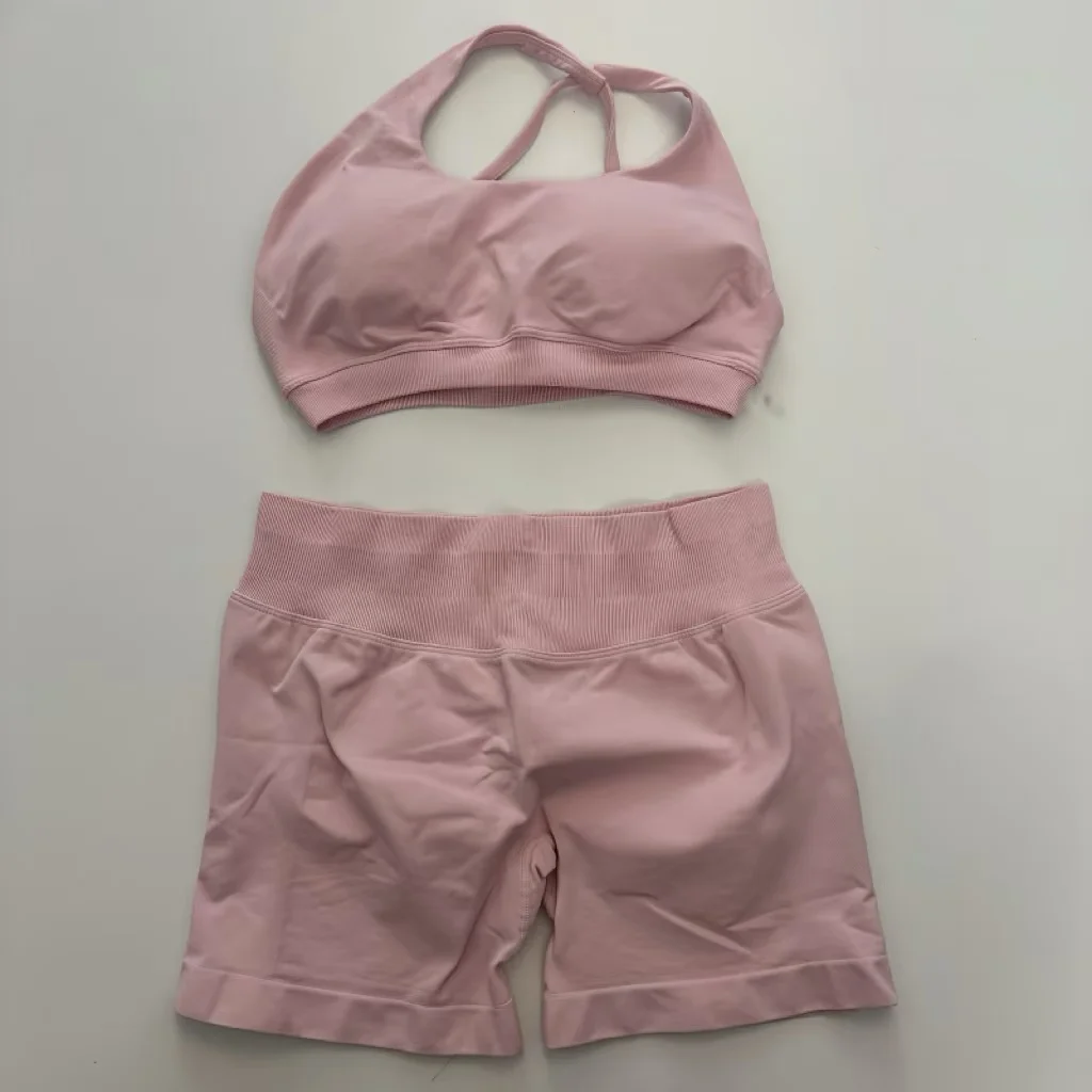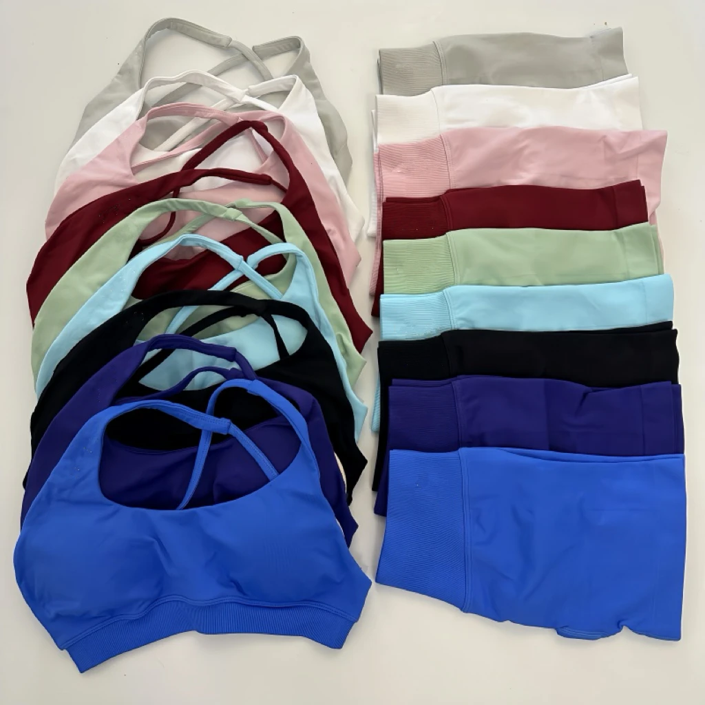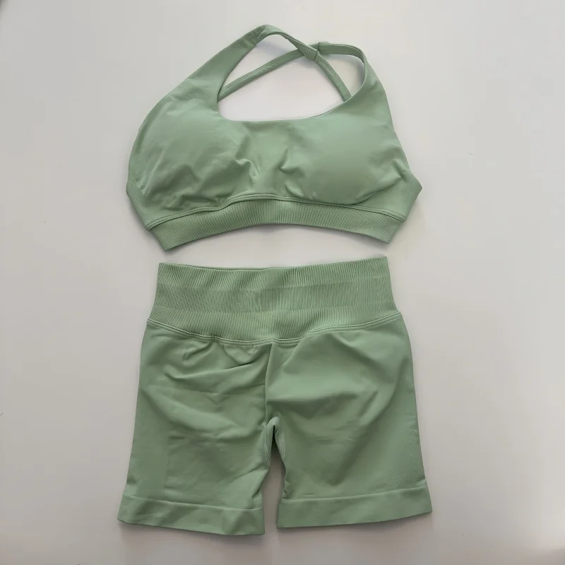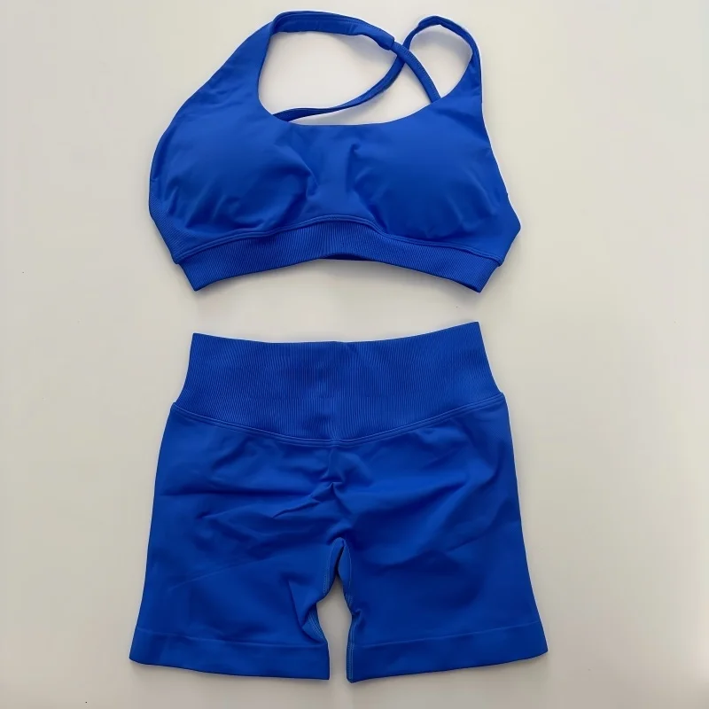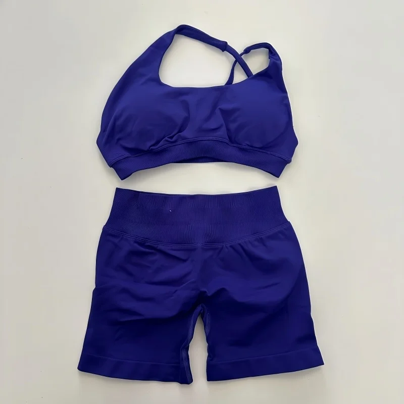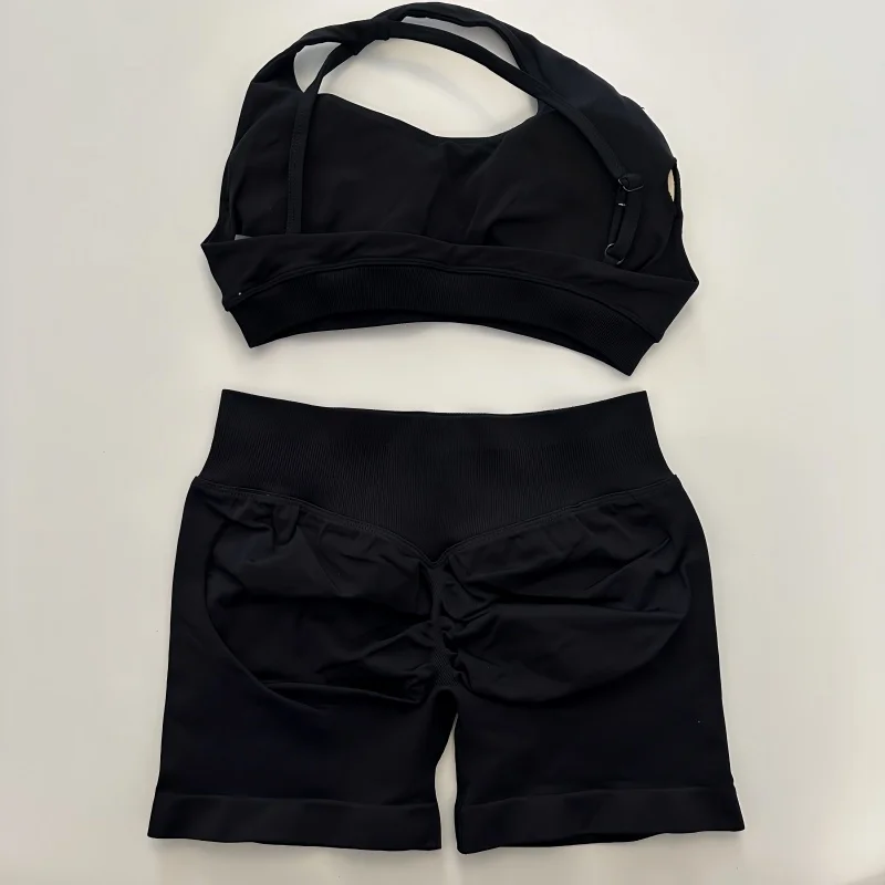 No Logo Yoga Asymmetric Gym Set Women Seamless Yoga Set Workout Shorts Sets Halter Sports Bra Scrunch Bum Shorts Fitness Clothes