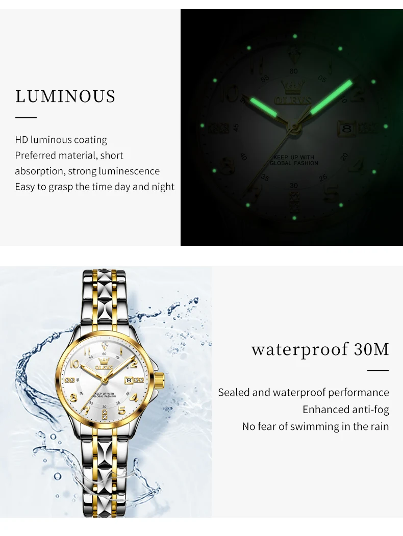 OLEVS 2910 Original Quartz Watches for Women Rhombus Steel Strap Waterproof Luminous Calendar Elegant Luxury Ladies Wristwatches