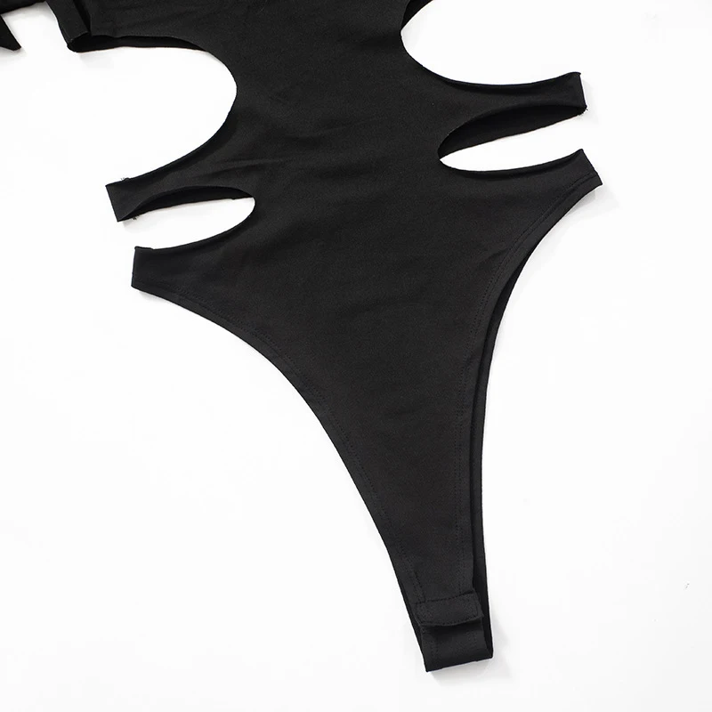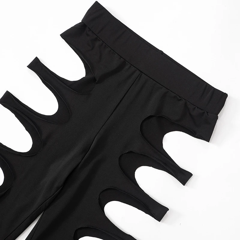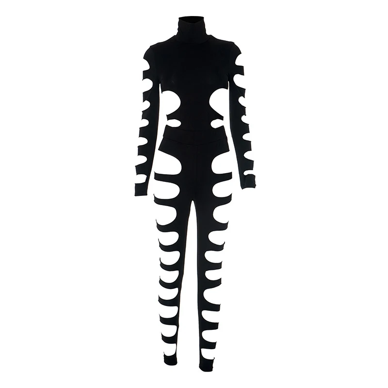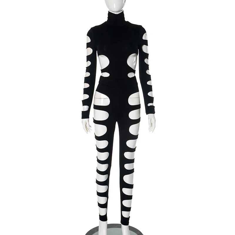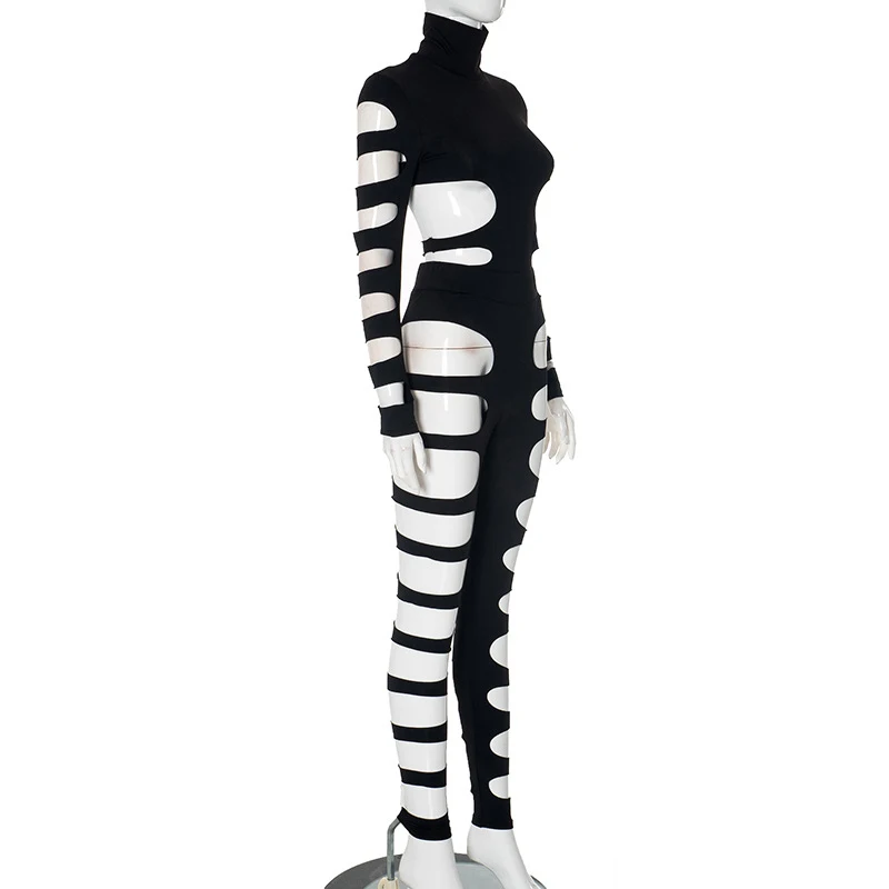 OMSJ Asymmetric Hot Girl Personality Set Hollowed Out Design Long Sleeve High Collar Bodysuit+Elastic Waist Leggings Pants Party