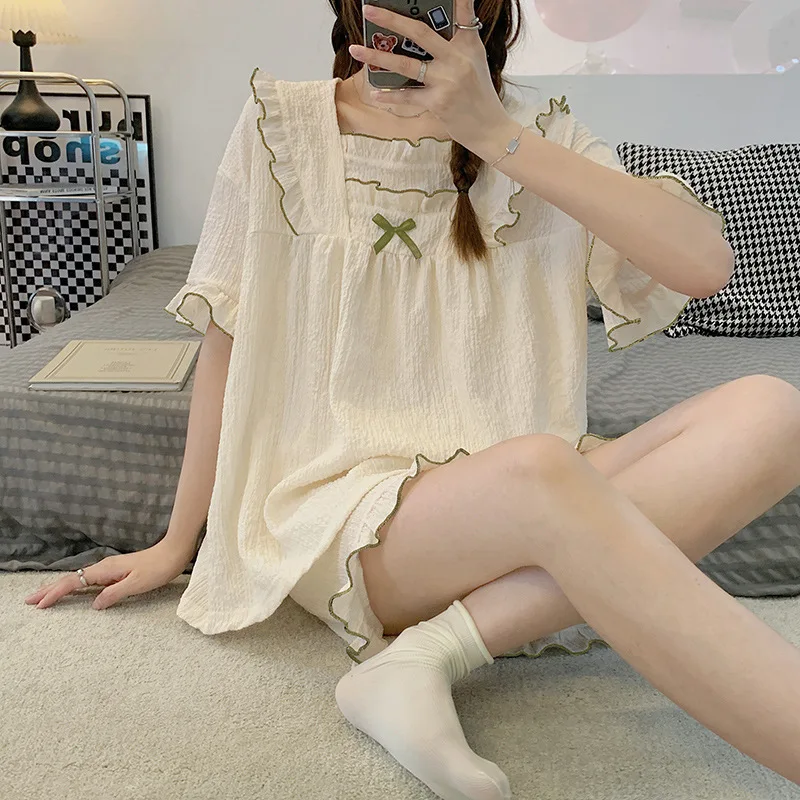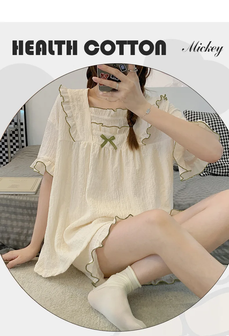 Pajamas Women's Summer Short-Sleeved Japanese Girls Solid-Coloured Breathable Large Size Bubble Cotton Casual Pajamas Homewear