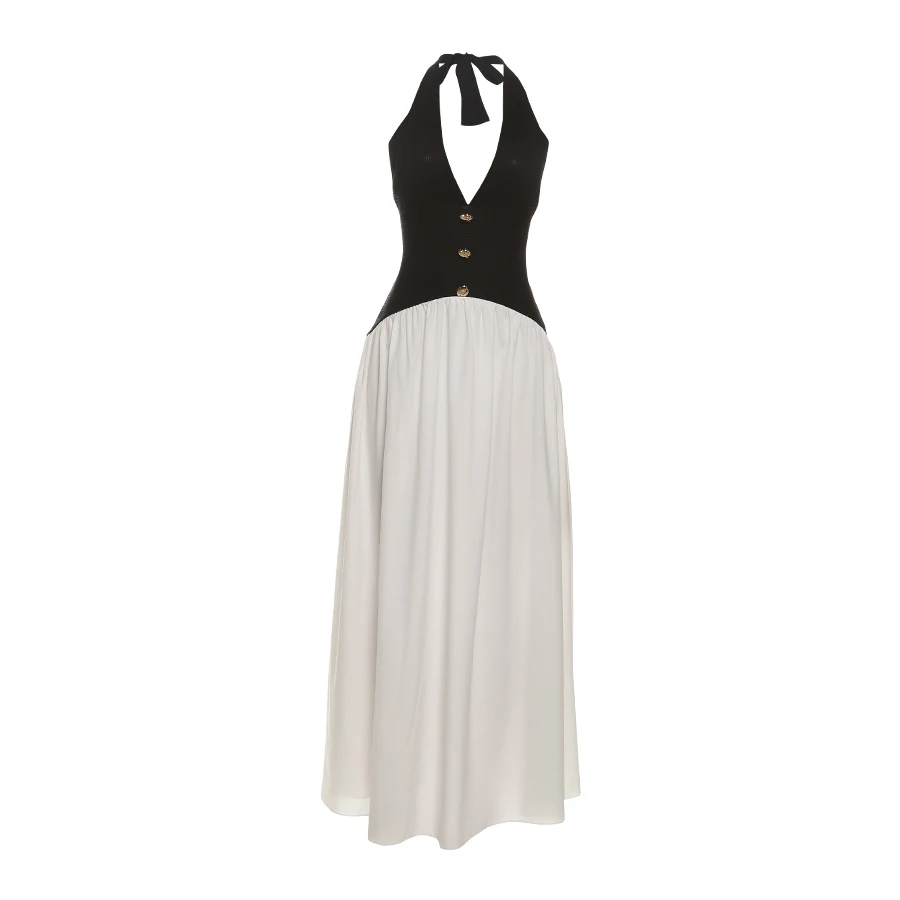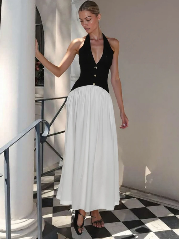 Patchwork Stripe Button Elegant Stretch Skinny French Maxi Bodycon Sexy Halter Dress Women Backless Low Chest Lace-Up Overalls