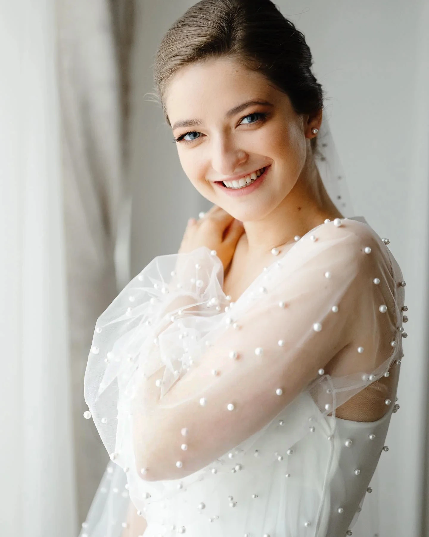 Pearl Robe For Women Long Sleeve Wedding Morning Robe Party Shawl Floor-Length Bridal Cape Sexy pearl robe Lantern Sleeve
