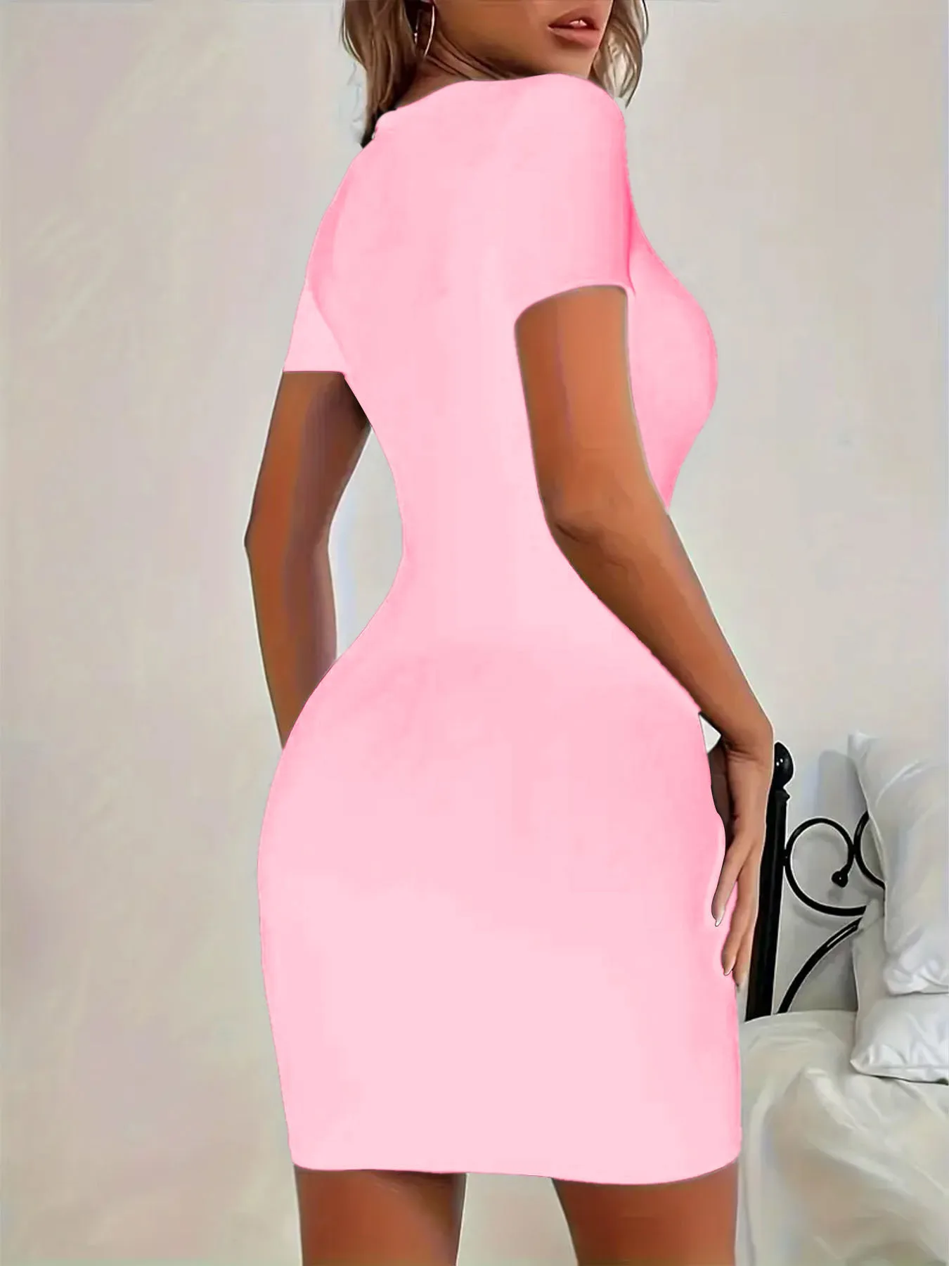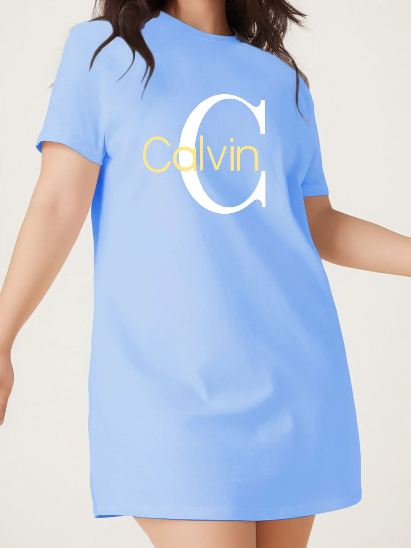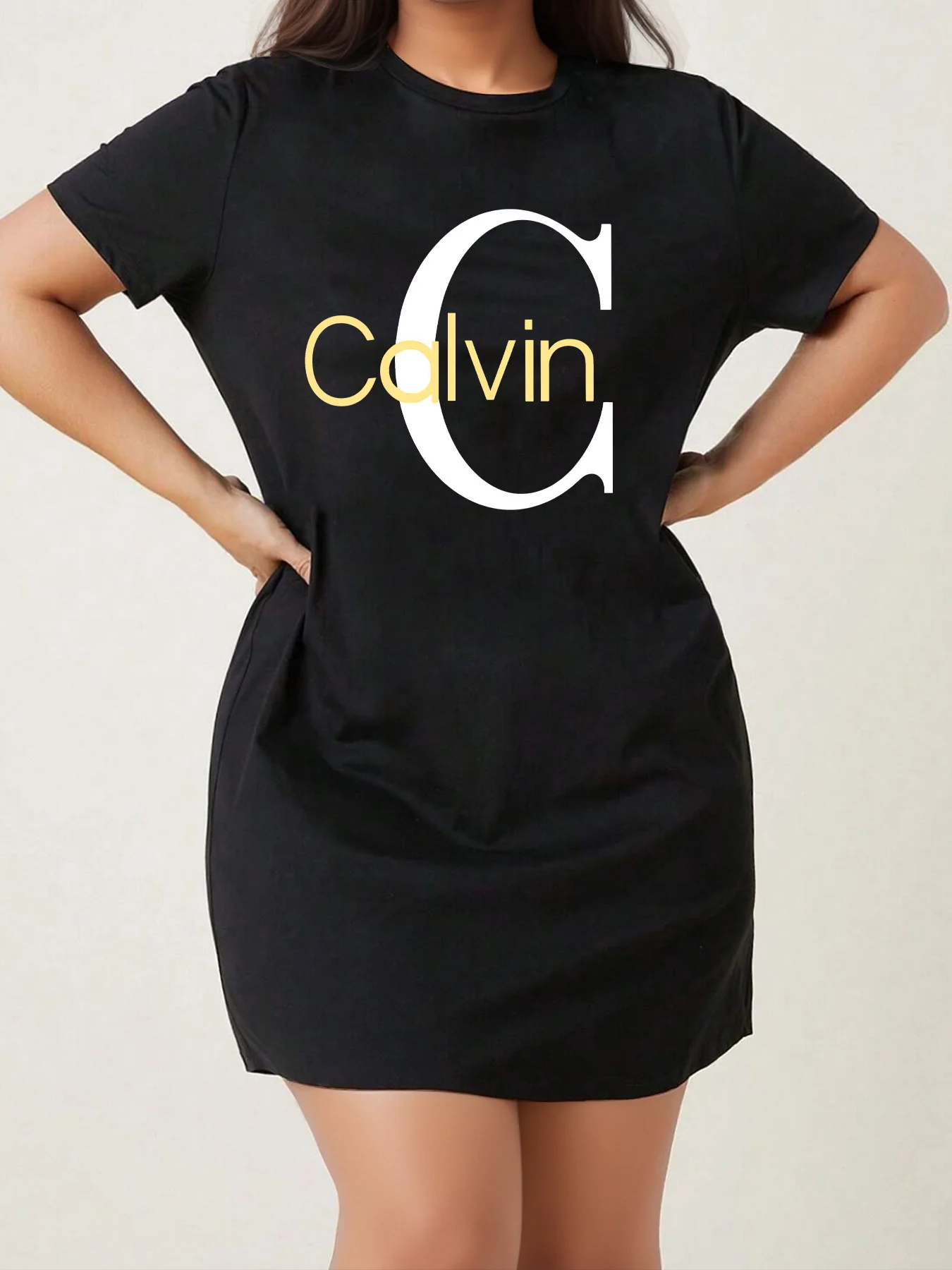 Plus Size Calvin Women's Breathable T-Shirt Dress Slim Fit Knee-Length Round Neck Casual Summer Dress with Bold Yellow Lettering