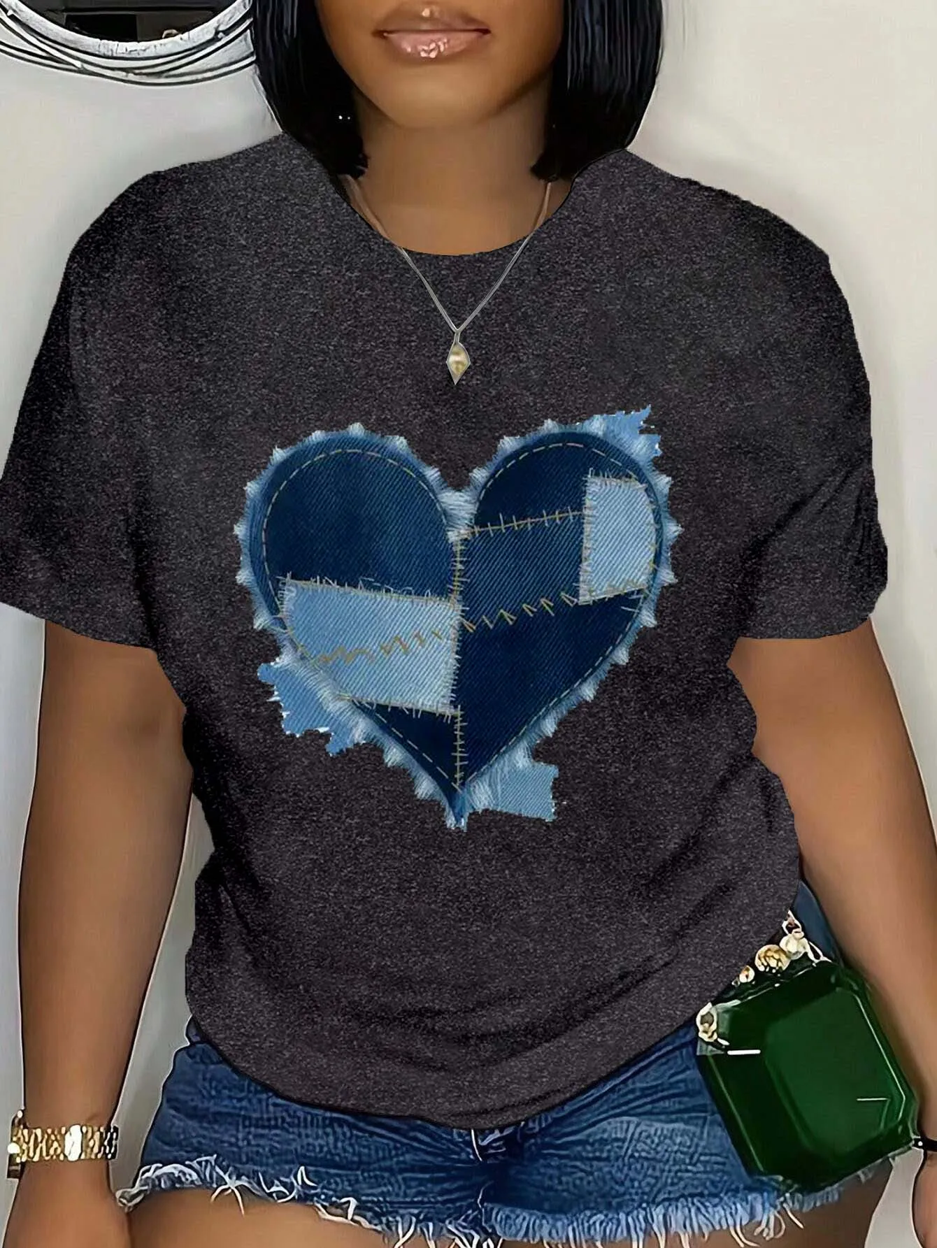 Plus Size Denim Heart Patchwork Tee Fashionable Plus Size Top With Unique Stitched Heart Design For Trendy Chic Looks