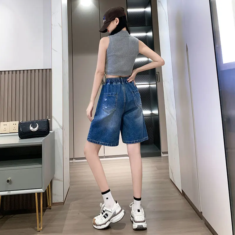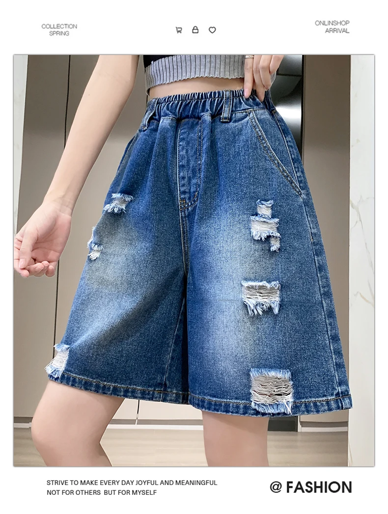 Plus Size Denim Shorts For Women 2024 Summer Wide Leg Loose Blue Jeans Shorts High Elastic Waist Half Length Casual Denim Shorts