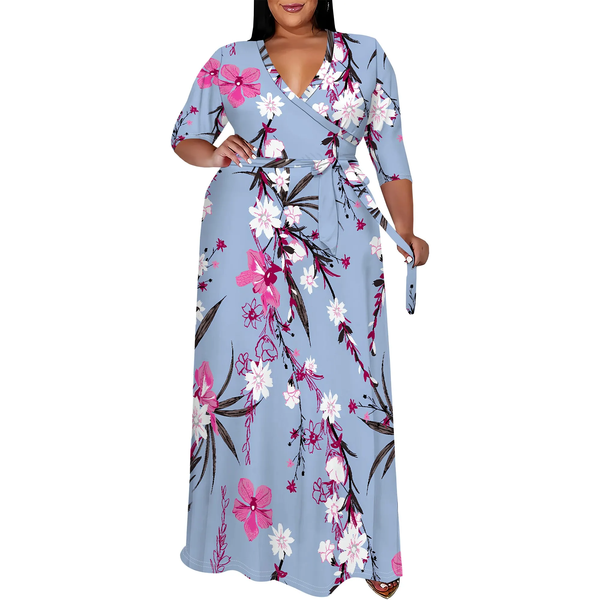 Plus Size Dress for Women - 3/4 Sleeve V-Neck Maxi Dress for Women with Belt and Pockets