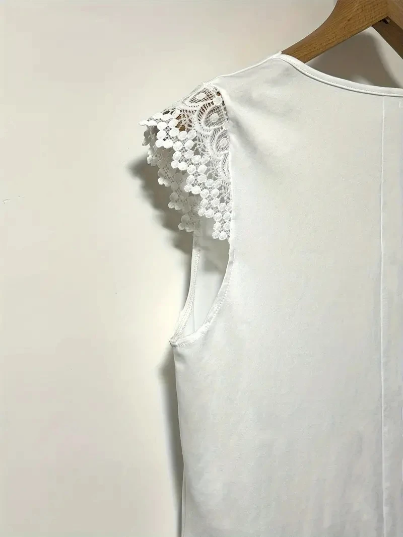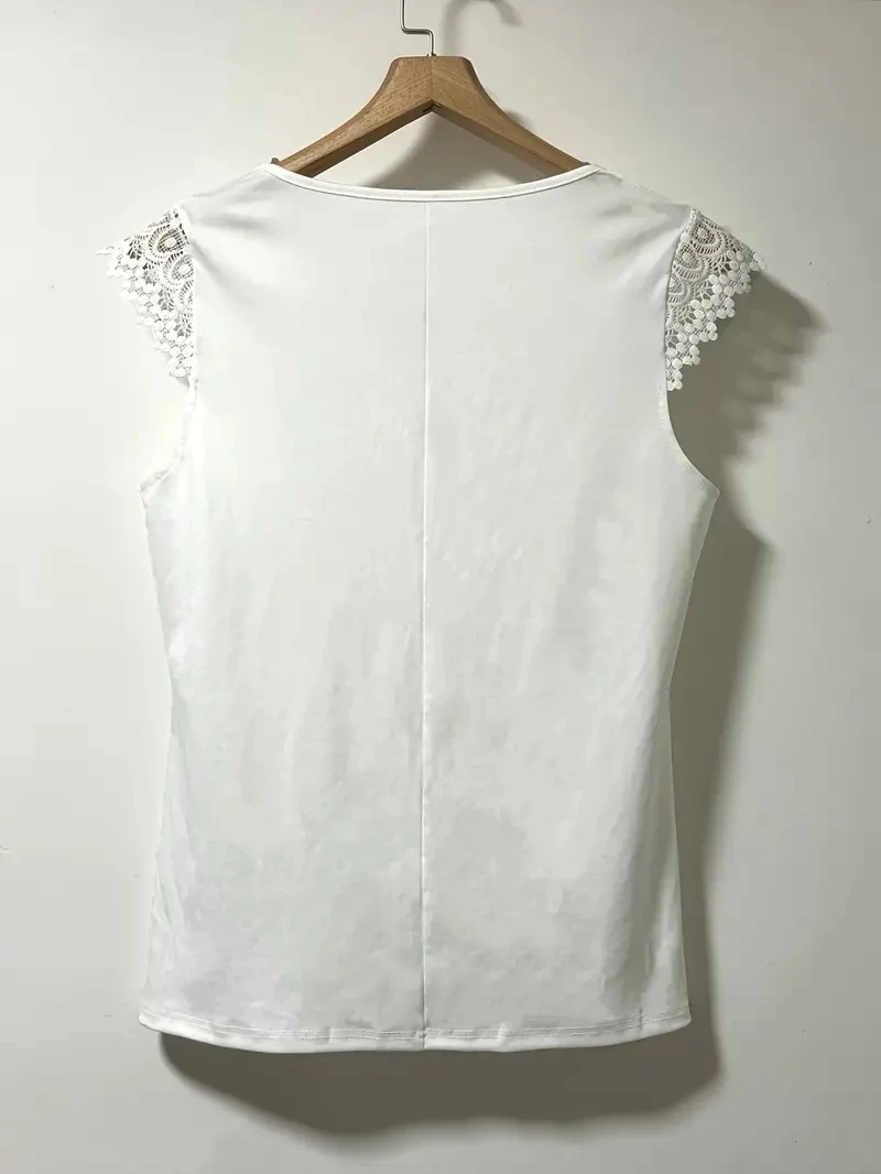 Plus Size Lace Stitching T-Shirt Casual Scallop Trim V Neck Short Sleeve T-Shirt Women's Plus Size Clothing