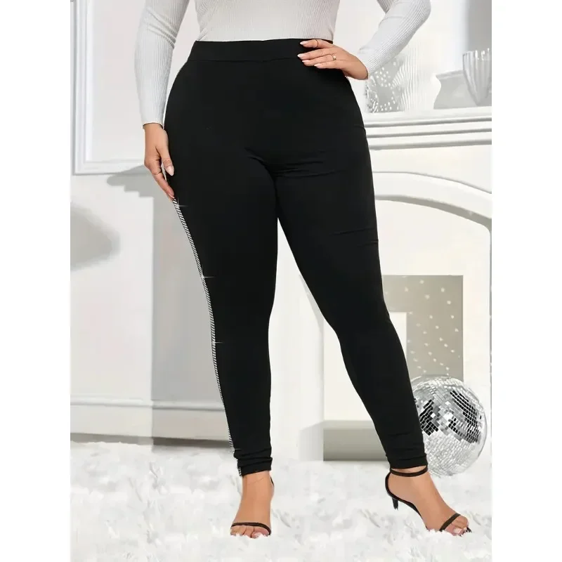 Plus Size New Women's Casual Rhinestone-Trimmed Tight Leggings - Stretchy Solid Color All-Season Machine Washable