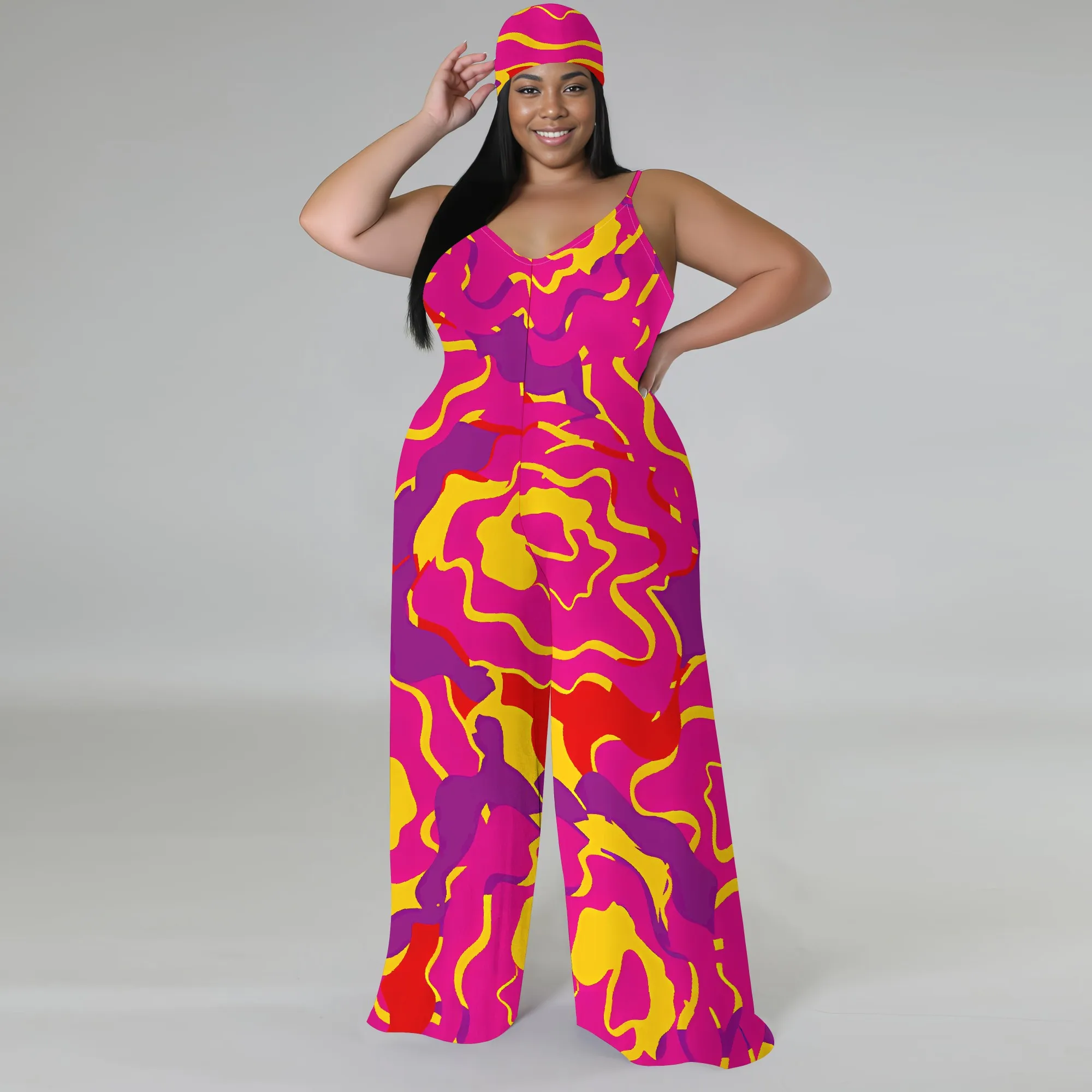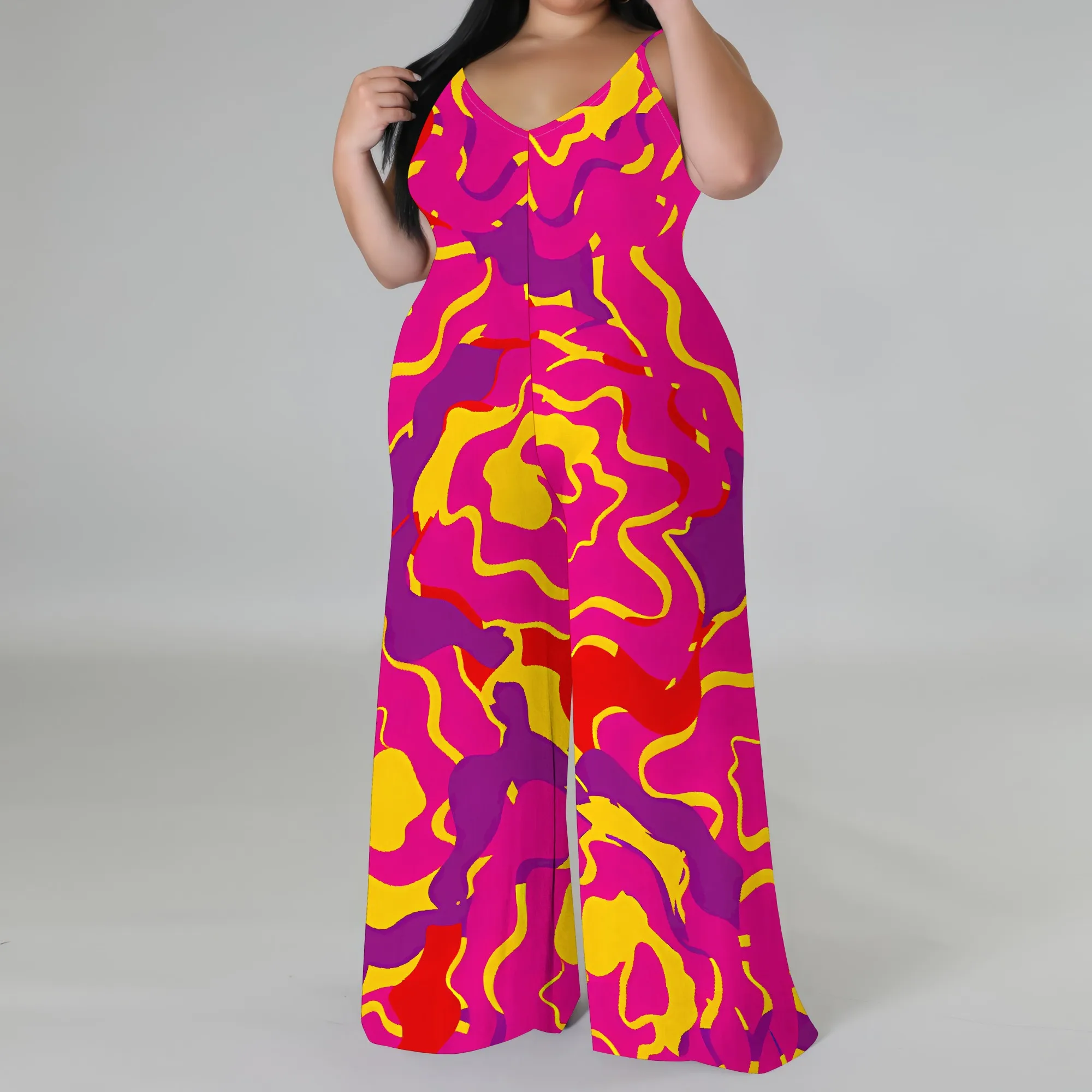 Plus Size Spaghetti Strap Jumpsuit Pink Yellow Abstract Print Wide Leg Summer Romper for Women