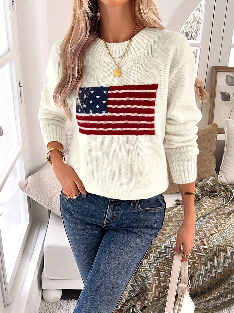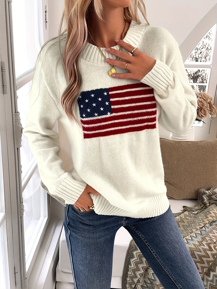 Plus Size Women Fashionable Loose Casual All-Match Sweater With Flag Print Flag Graphic Long Sleeve Sweater Knit