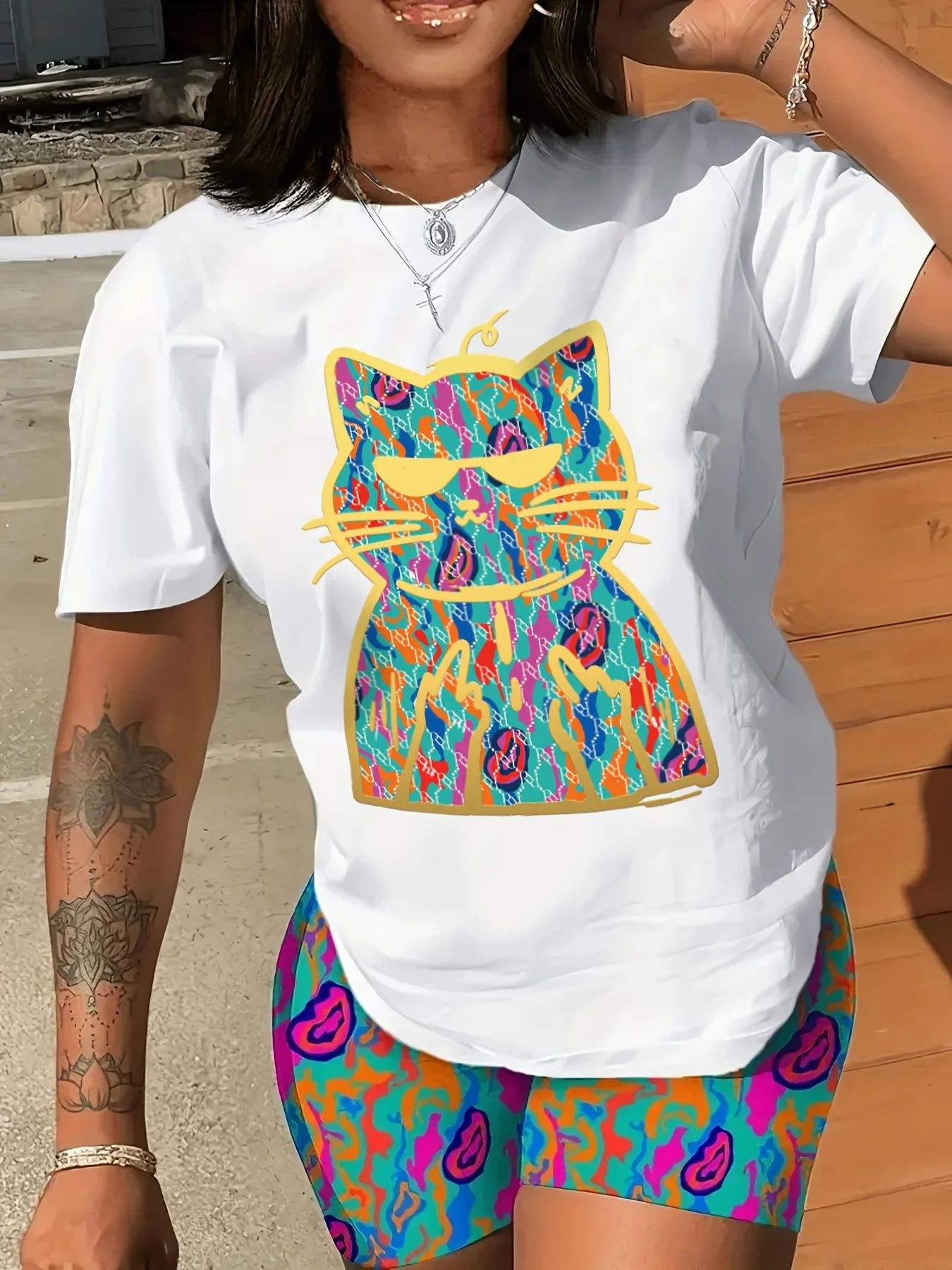 Plus Size Women's Cartoon Rabbit Print T-shirt, Casual Crew Neck Short Sleeve Summer T-shirt, Ladies Cute O-Neck Clothing