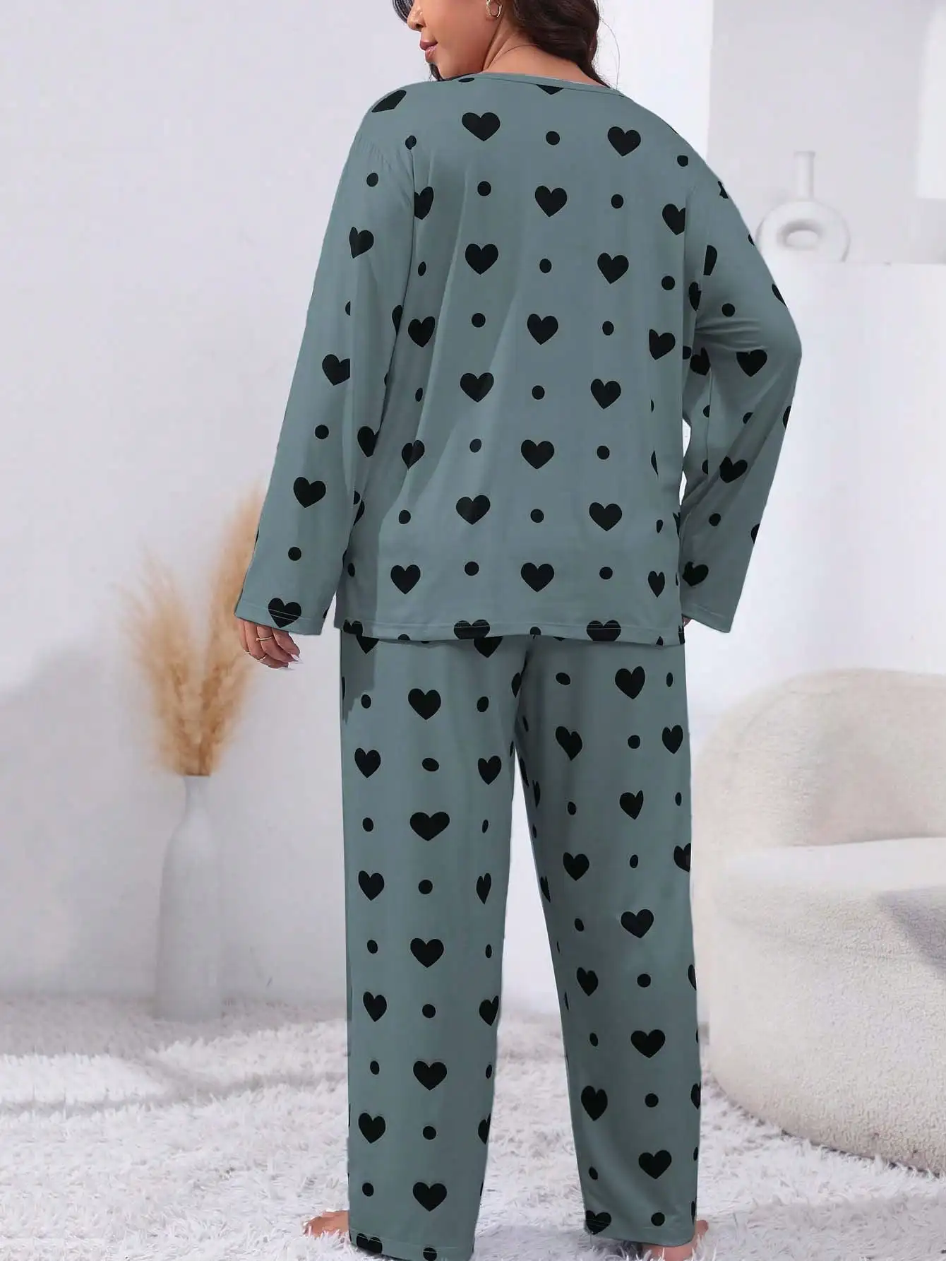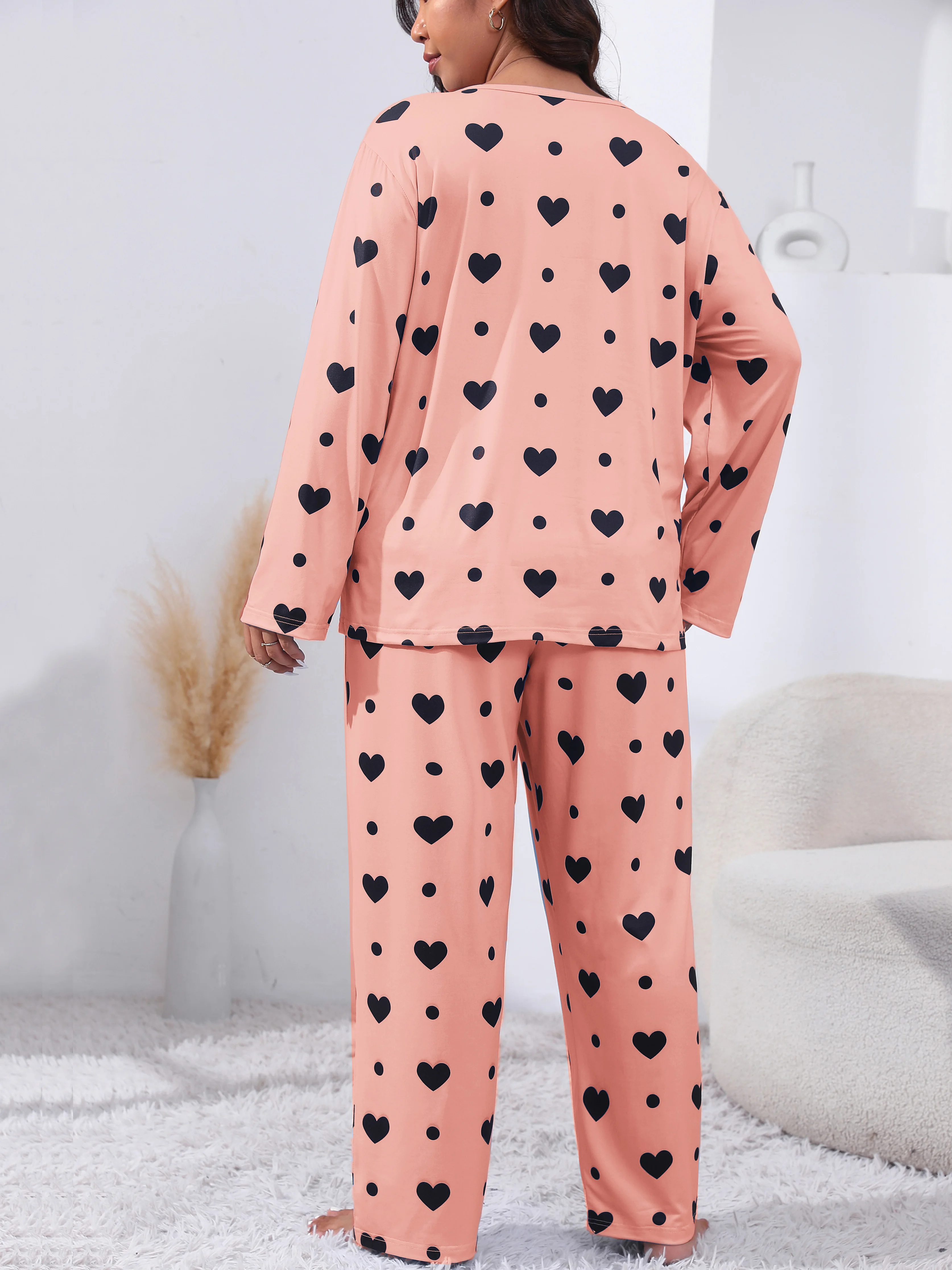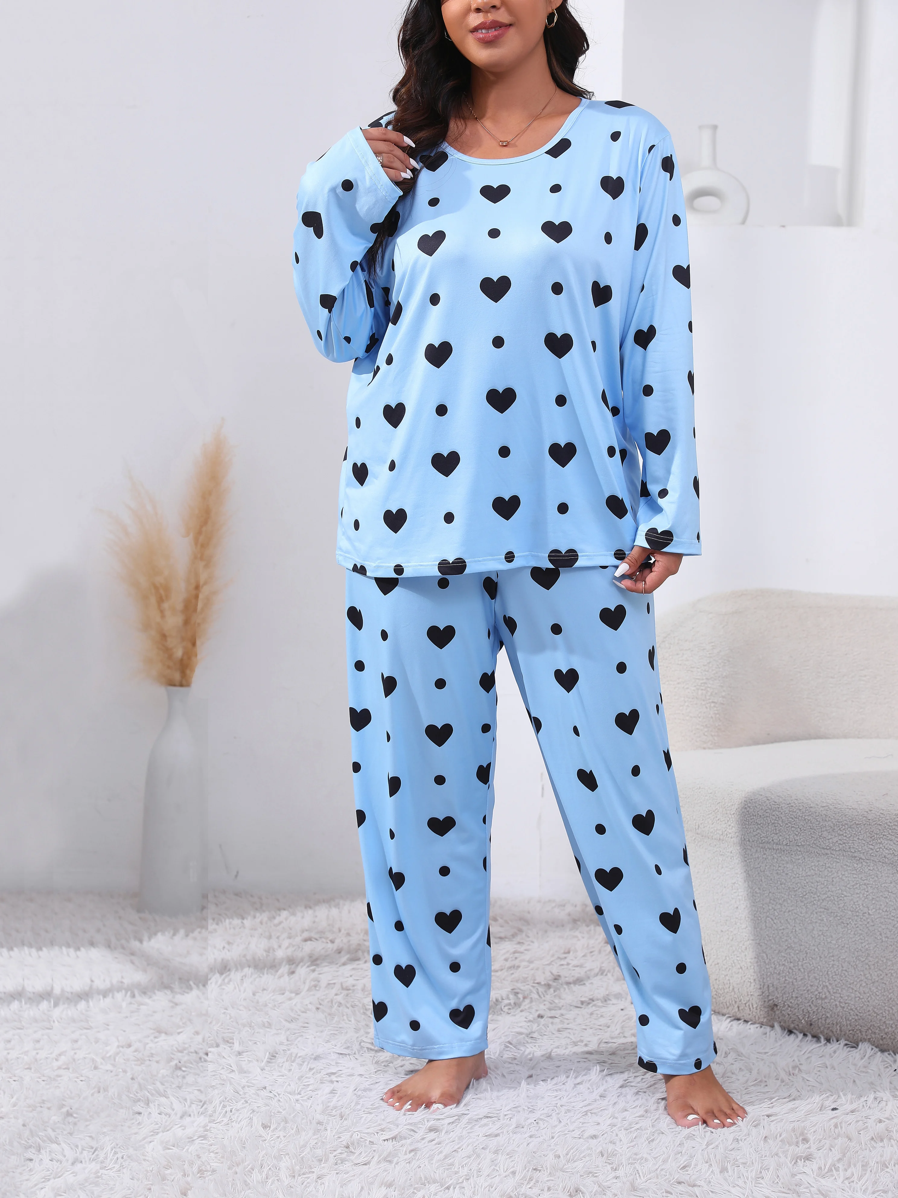 Plus Size Women's Heart Print Long Sleeve T-Shirt And Pants With Elastic 2pc Pajama Set,Women Round Neck Top and Trouser Pajama