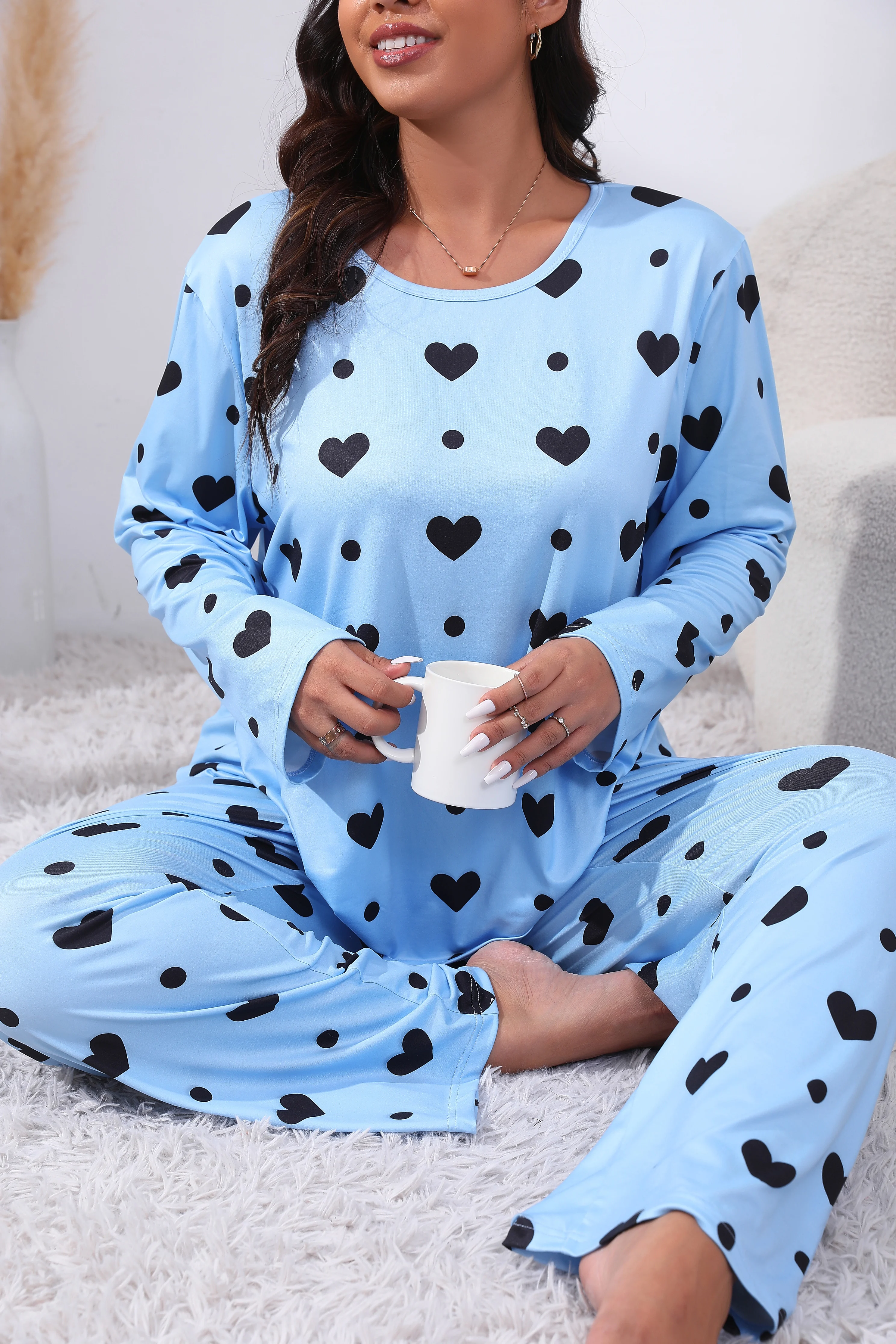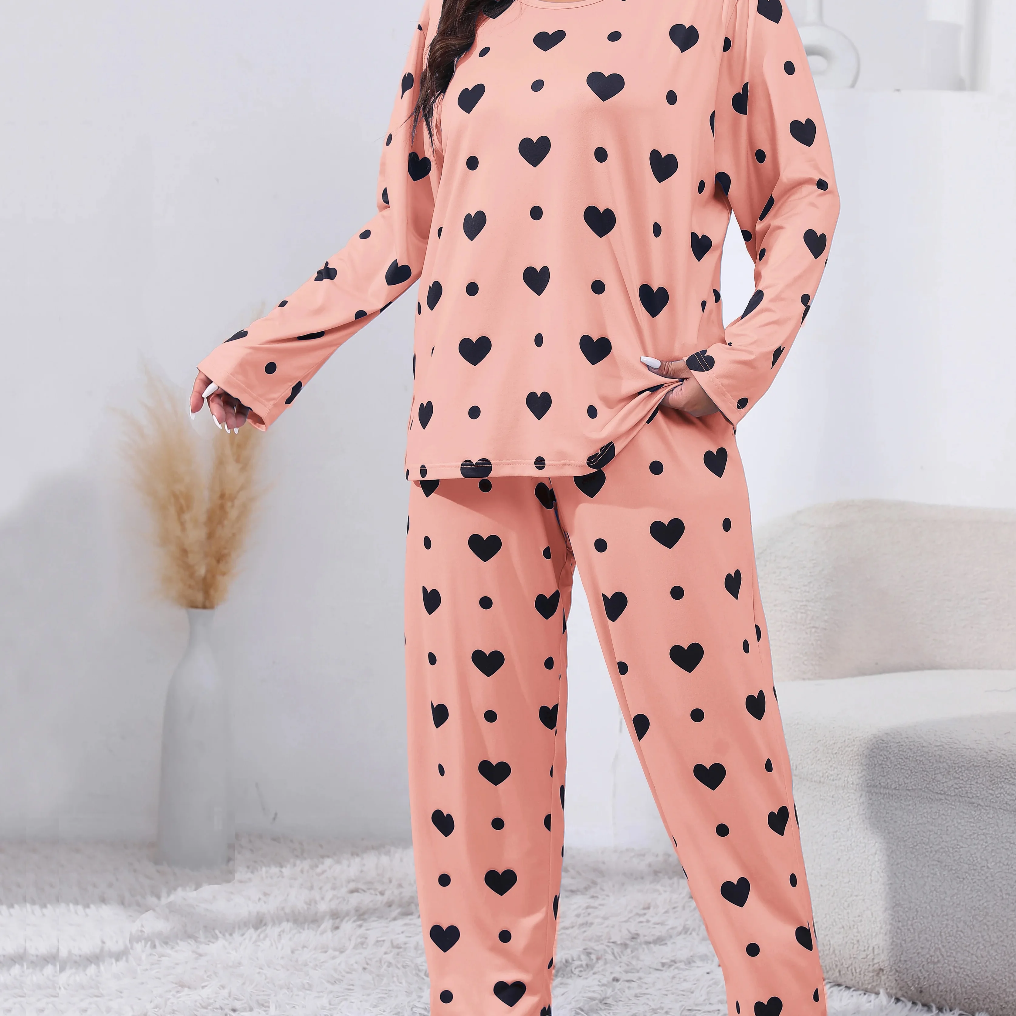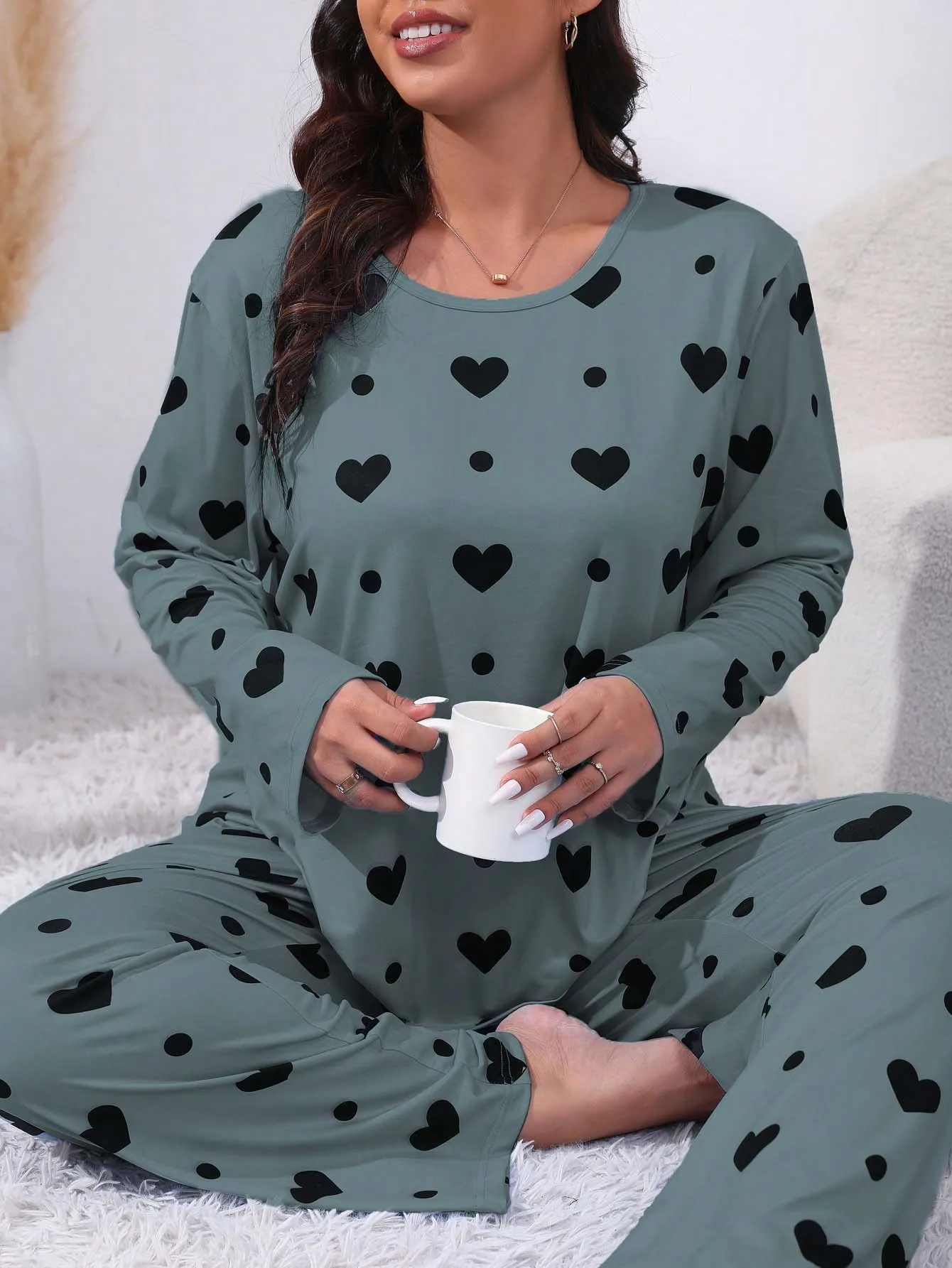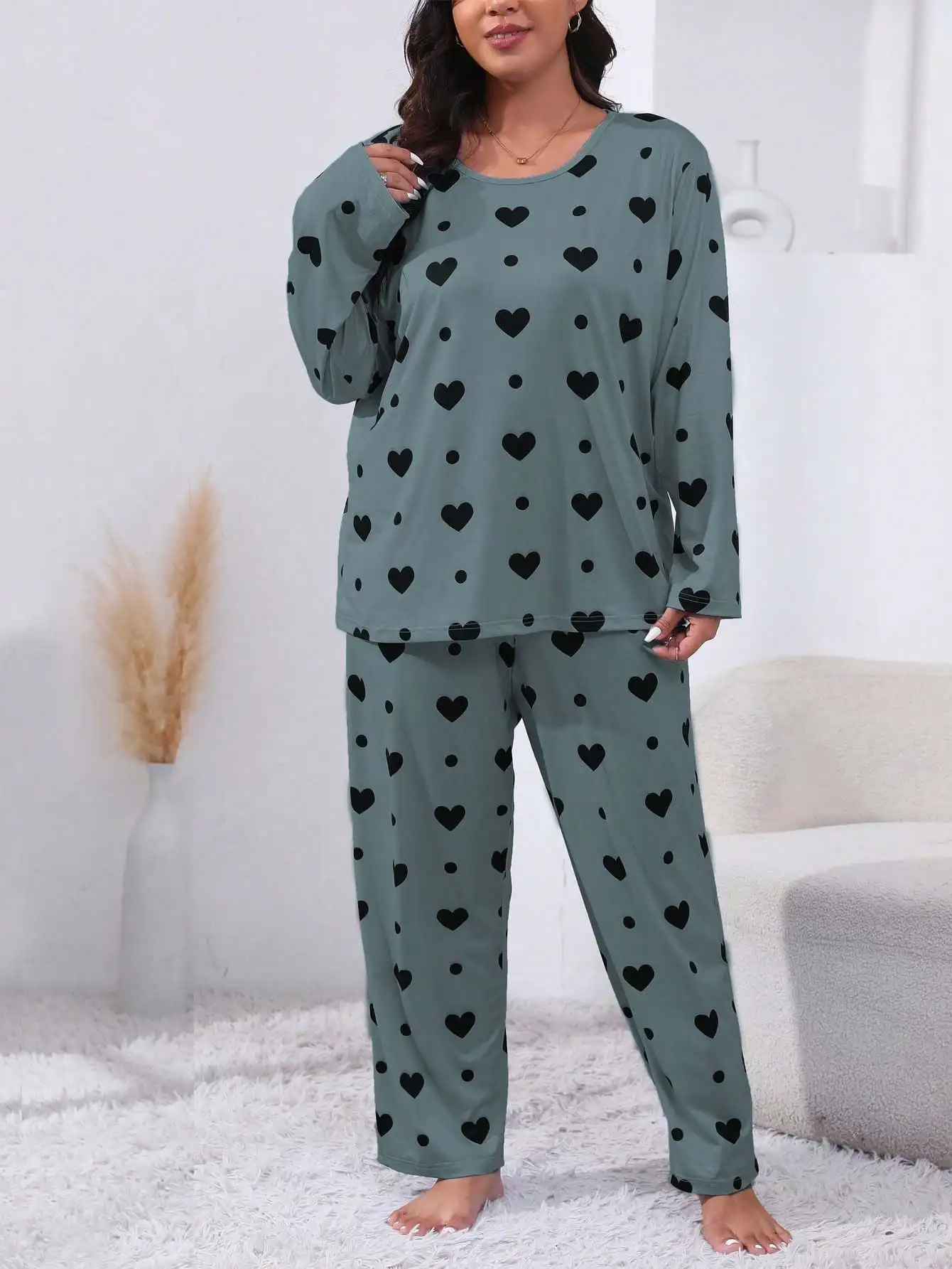 Plus Size Women's Heart Print Long Sleeve T-Shirt And Pants With Elastic 2pc Pajama Set,Women Round Neck Top and Trouser Pajama