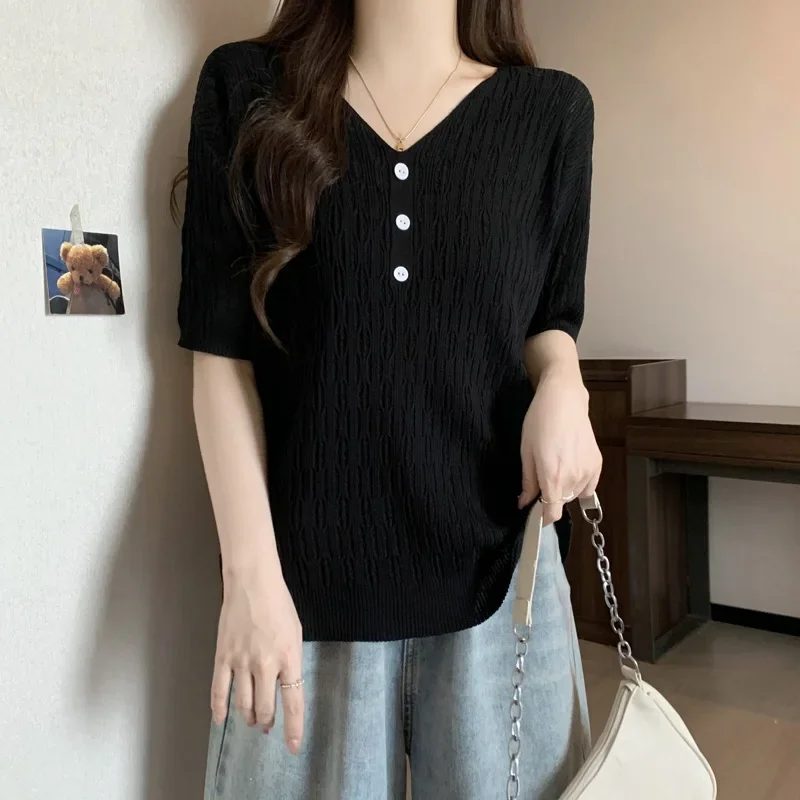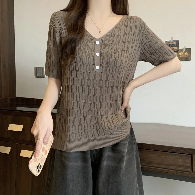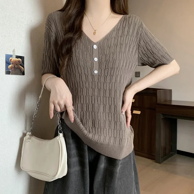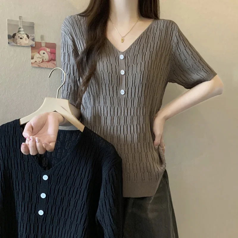 Plus Size Women's Summer New Style Slim Fit Knitted Top Belly Covering T-Shirt for Plump Sister V-Neck Big Code Sweater