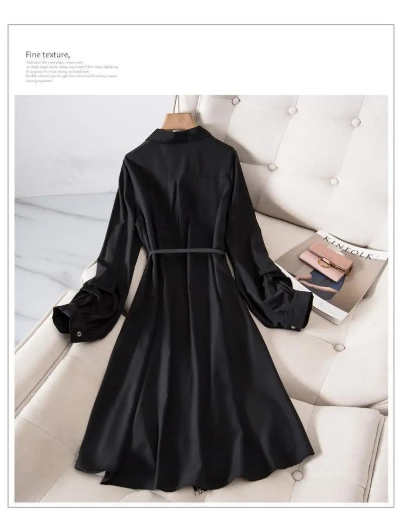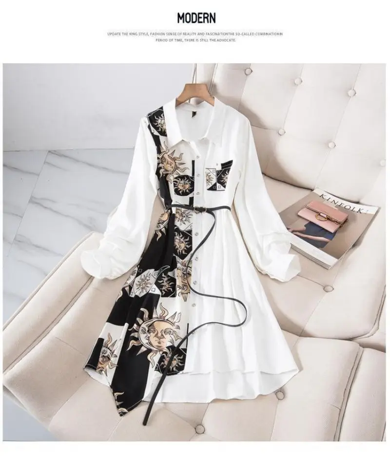 Print Vintage A-Line With Belt Loose Polo Neck Women's Dress Single-Breasted Knee Length Dresses For Women Clothing 2024 Fashion