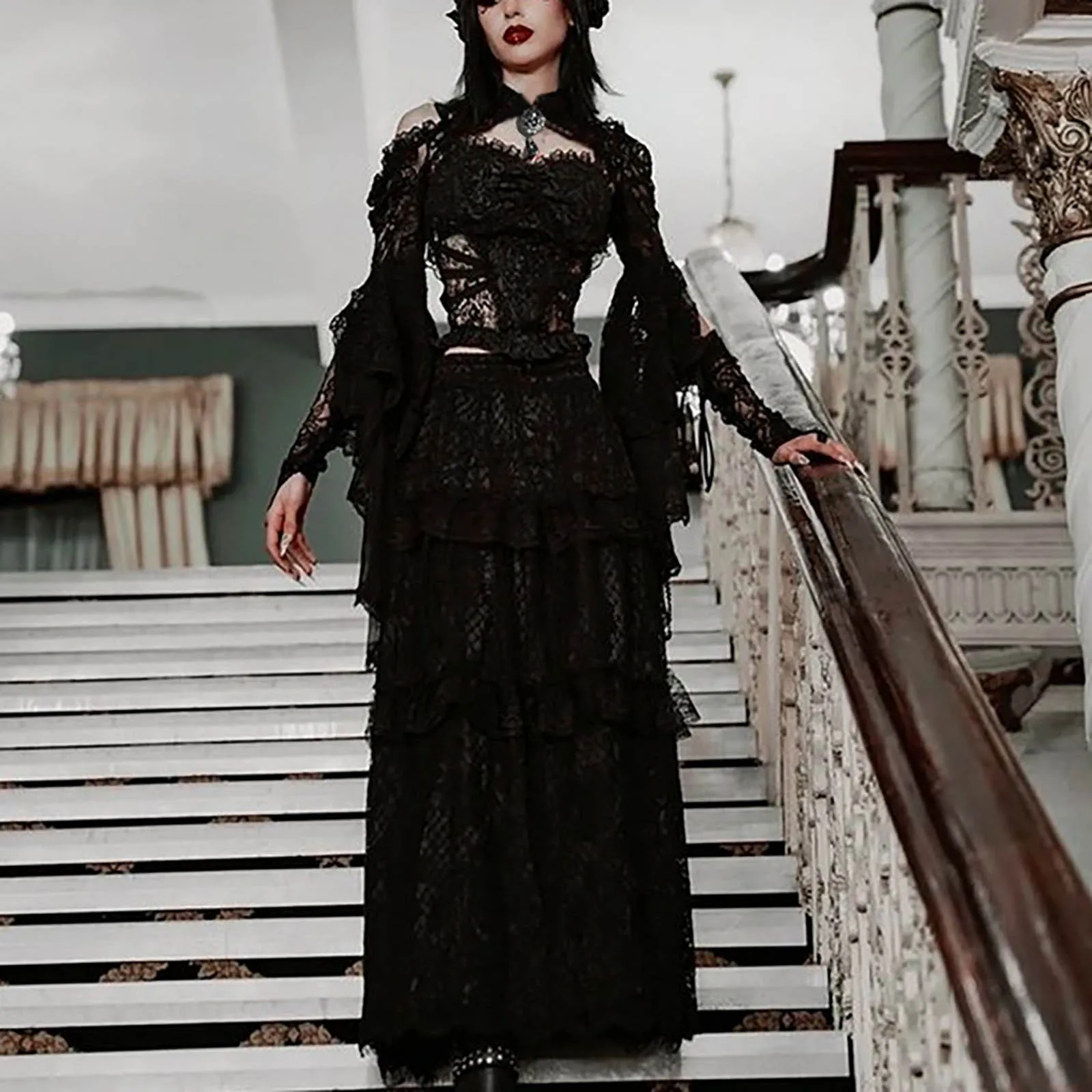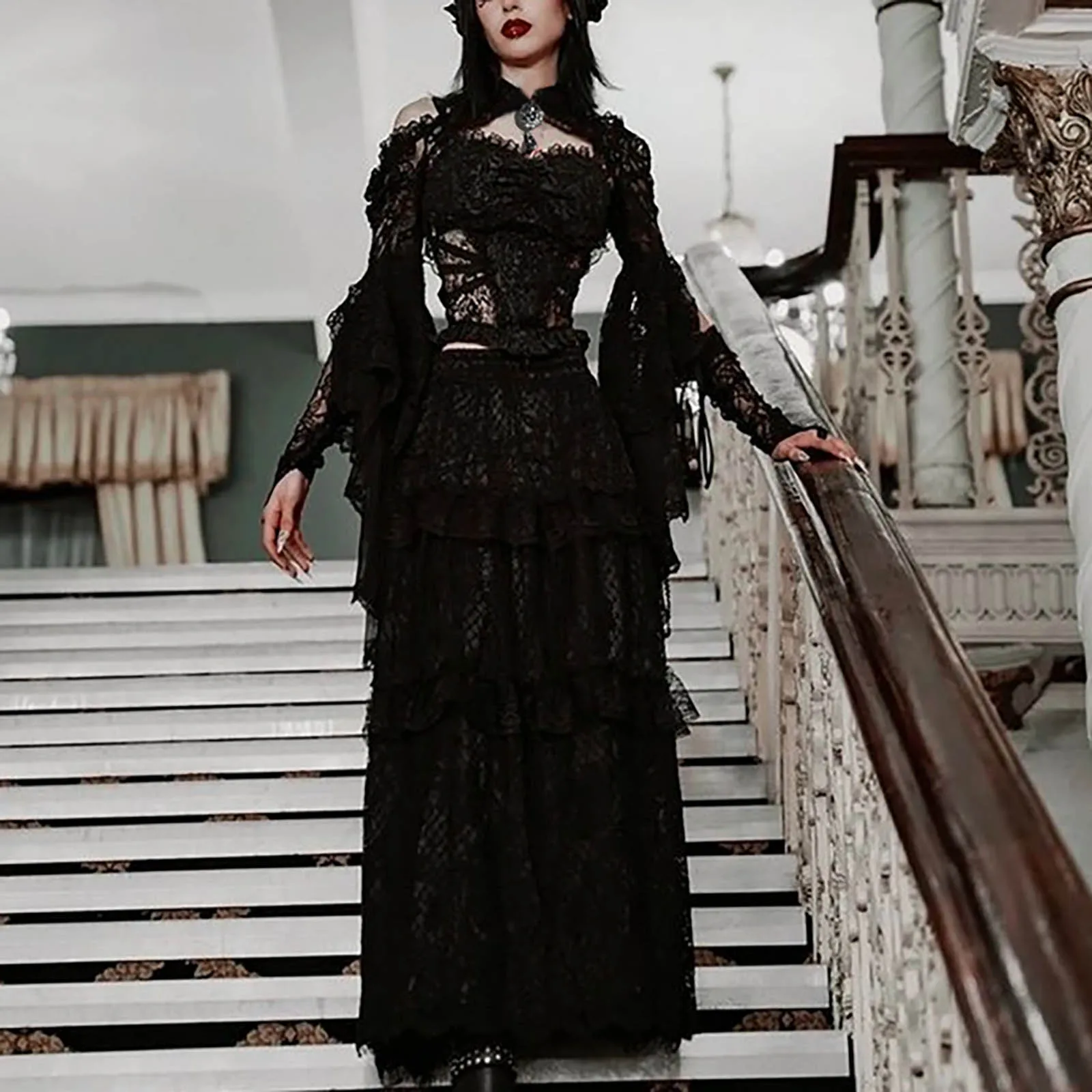 Punk Bolero Shrug Top Trad Goth Black Shawls Flared Sleeve Cover Wraps for Evening Dresses Short Cardigan See-Through Lace Shrug