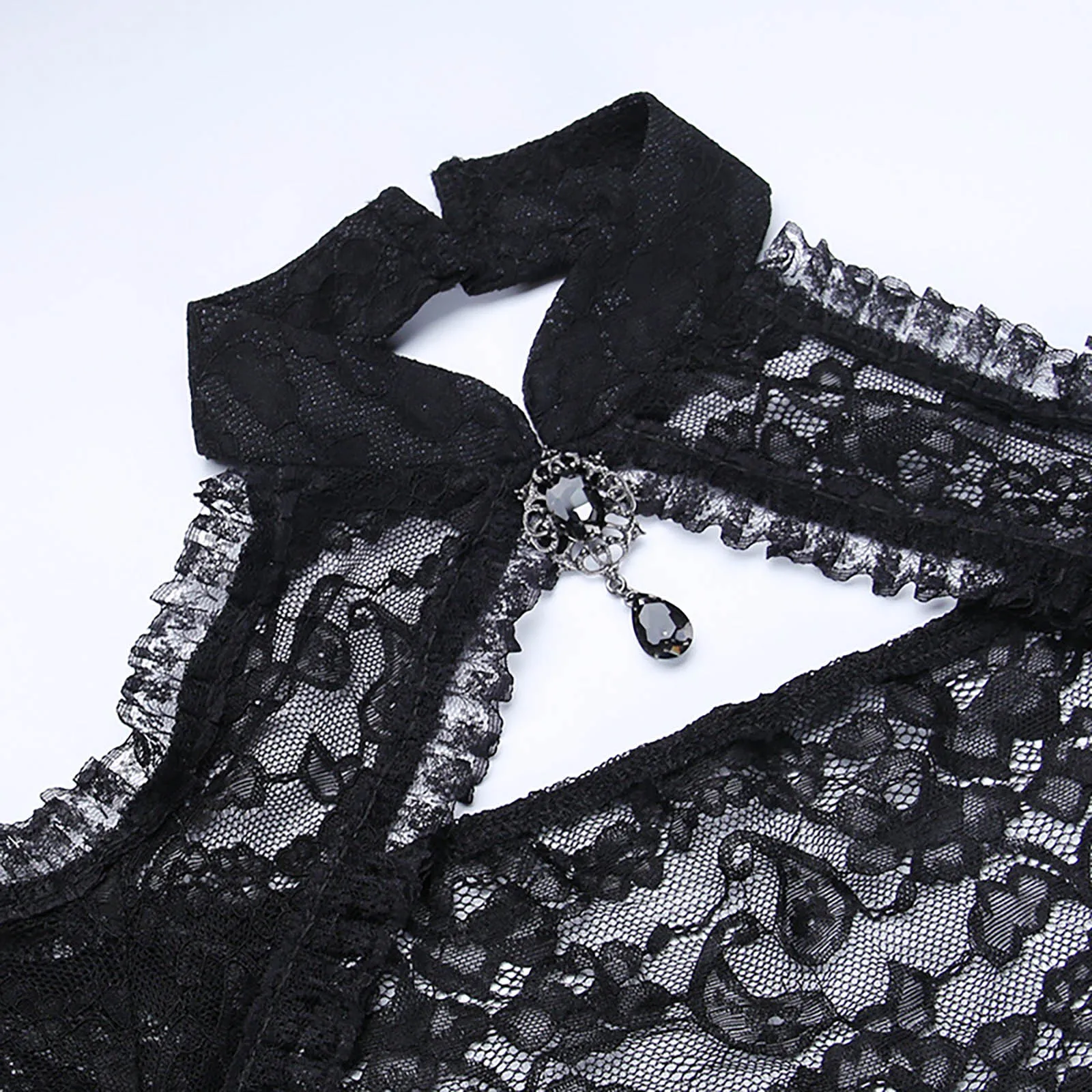 Stand collar is decorated with two big rhinestones for a luxurious and mysterious look. Back with a button for easy wearing.
