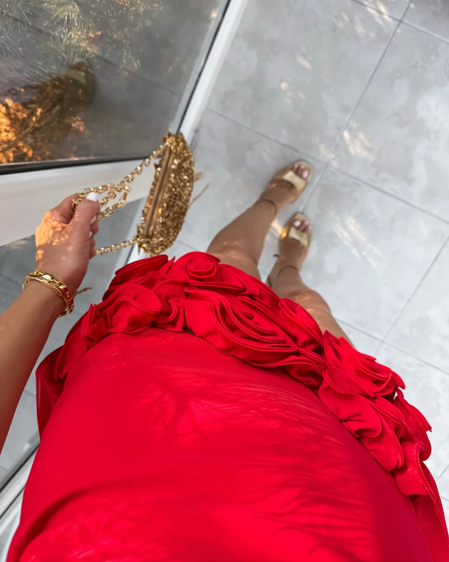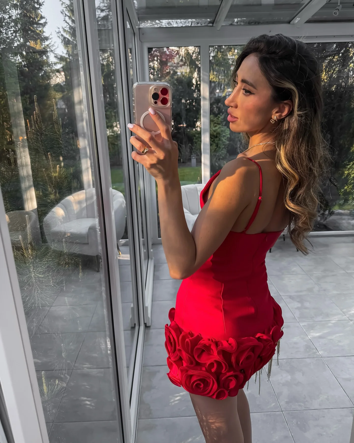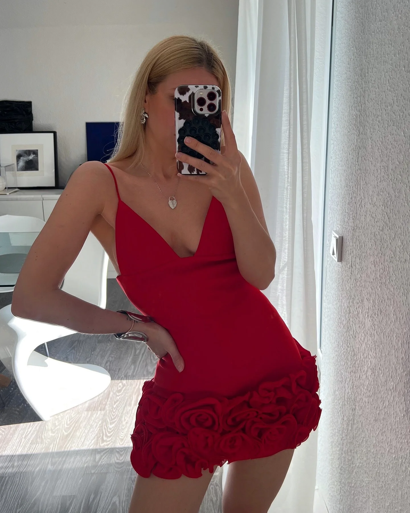 Red 3d Flower Splicing Sling Short Dresses Women Elegant V Neck Sleeveless High Waist Mini Dress Summer New Party Lady Robes