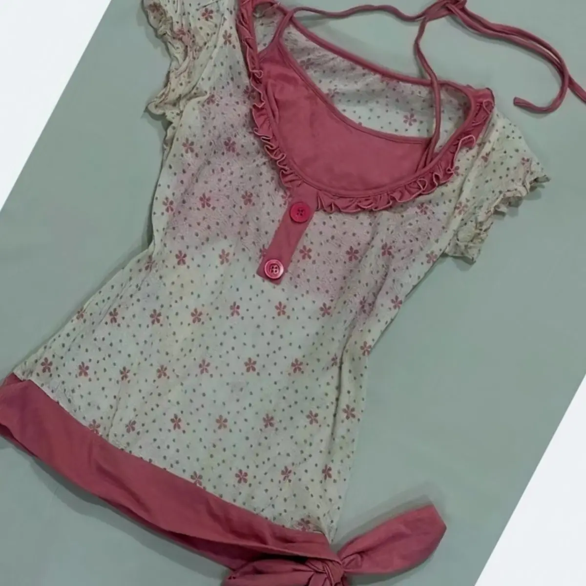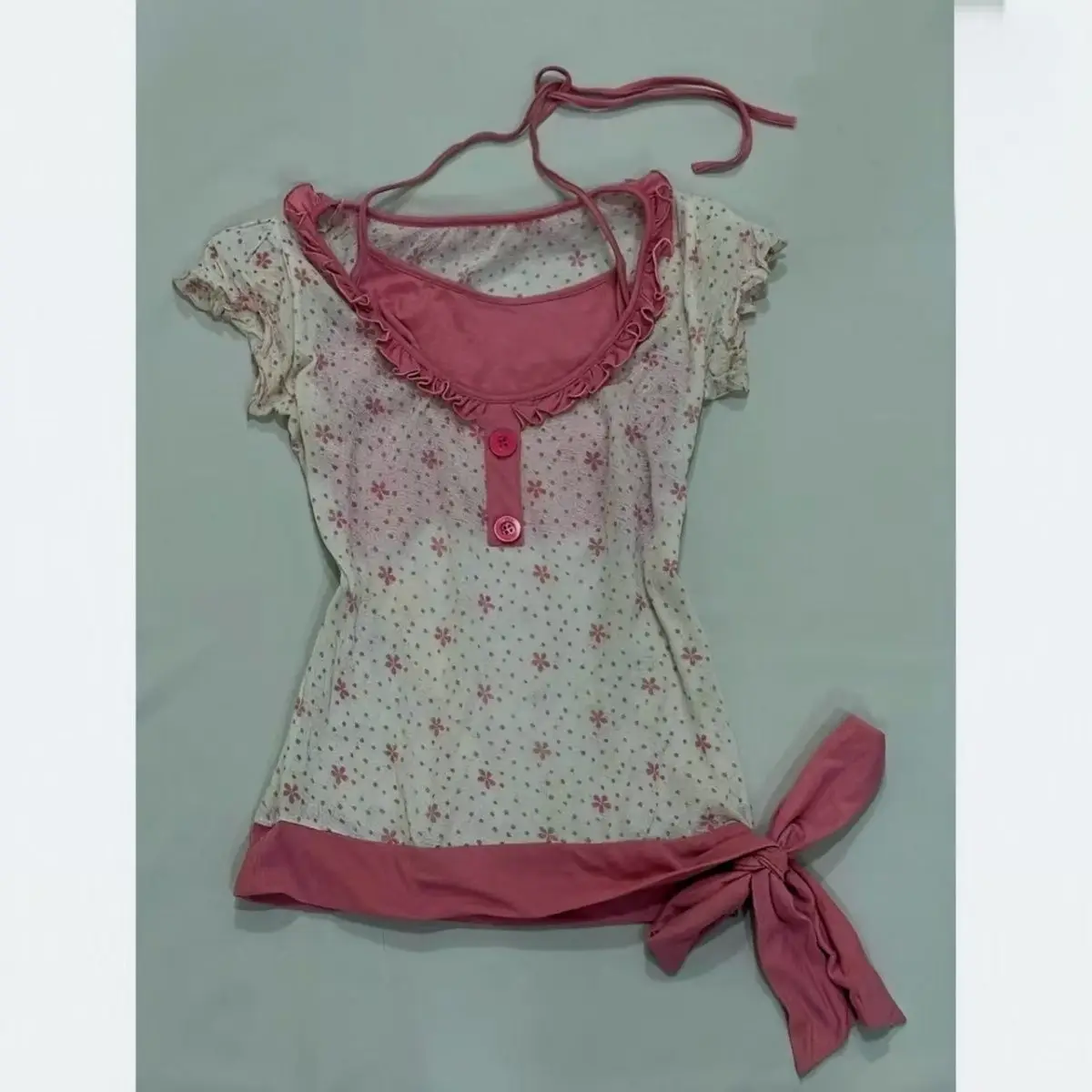 Retro Floral Print Fake Two-piece Short-sleeved T-shirt Women Y2K Millennial Hot Girl Sweet Slim Harajuku Street Casual Top
