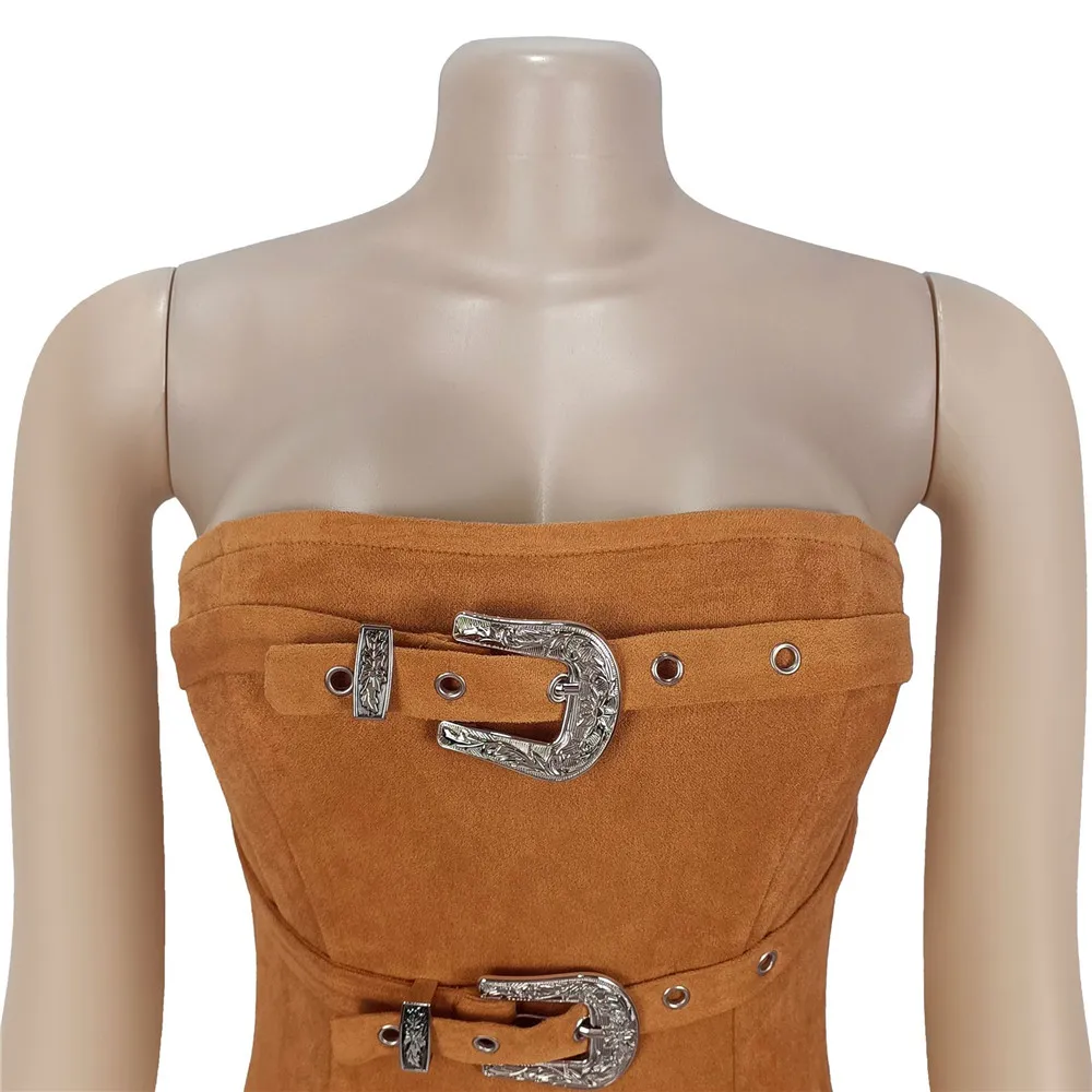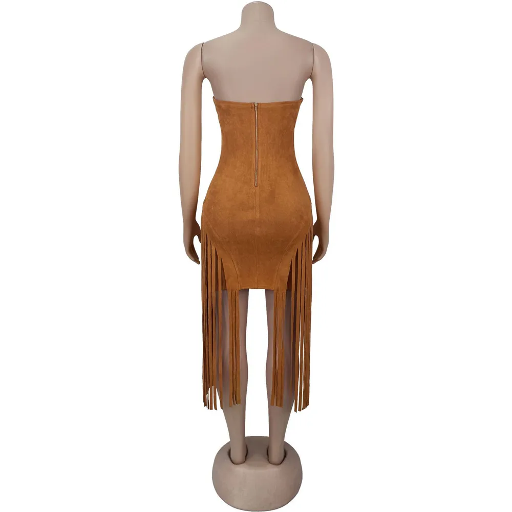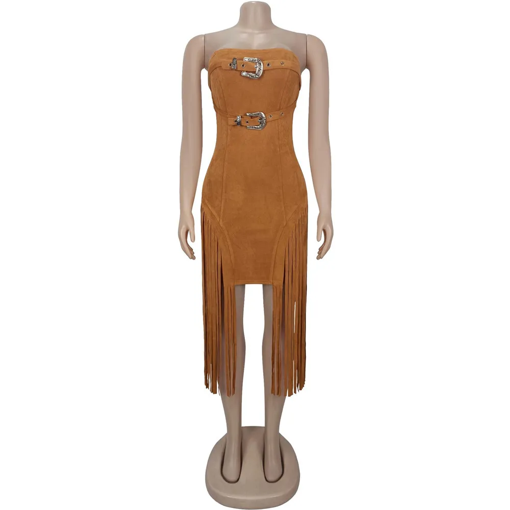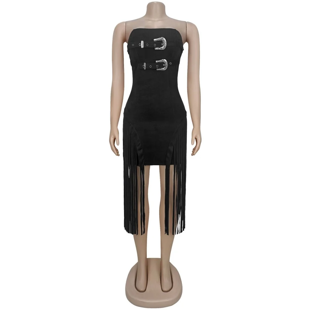 RLMABABY Sexy Strapless Tassel Bodycon Mini Dress Women Gown Slim Backless Sleeveless Metal Buckle Club Party Sheath Short Dress