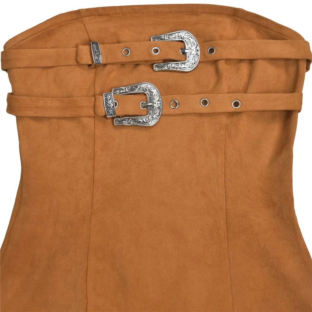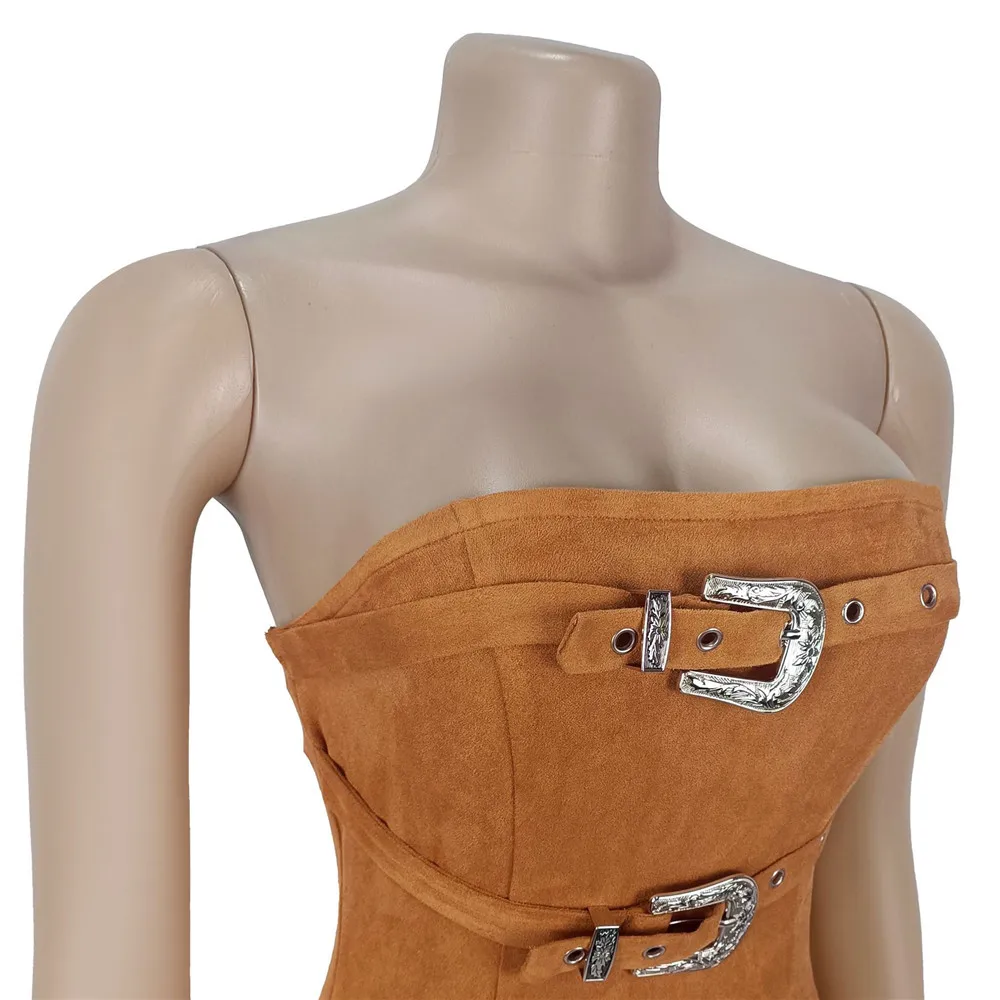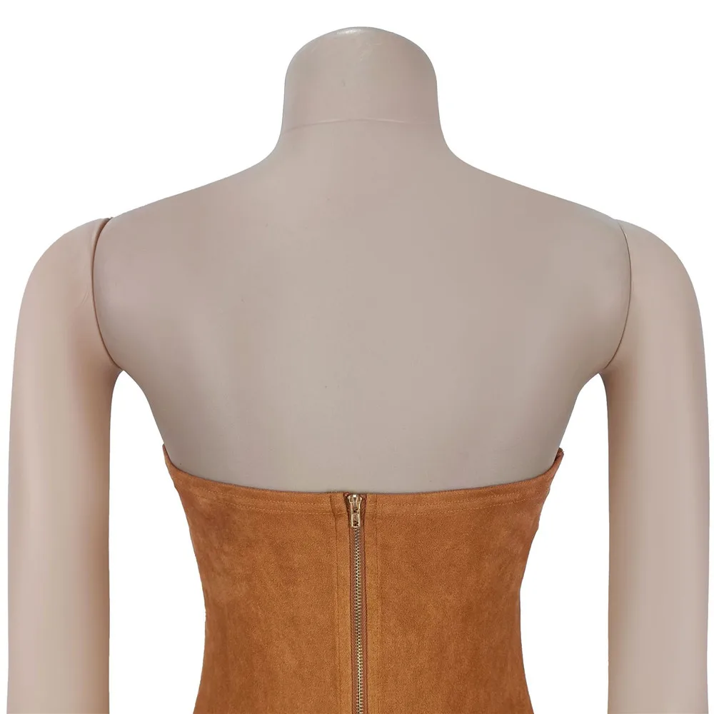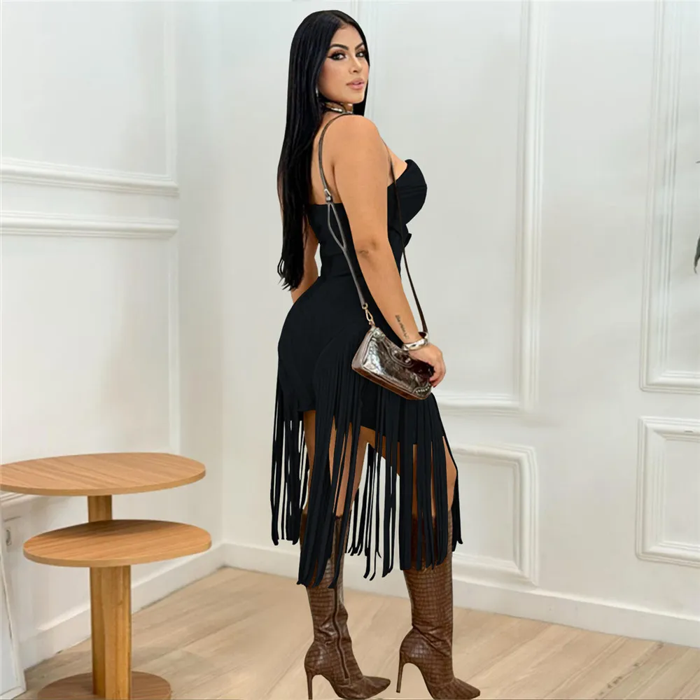 RLMABABY Sexy Strapless Tassel Bodycon Mini Dress Women Gown Slim Backless Sleeveless Metal Buckle Club Party Sheath Short Dress