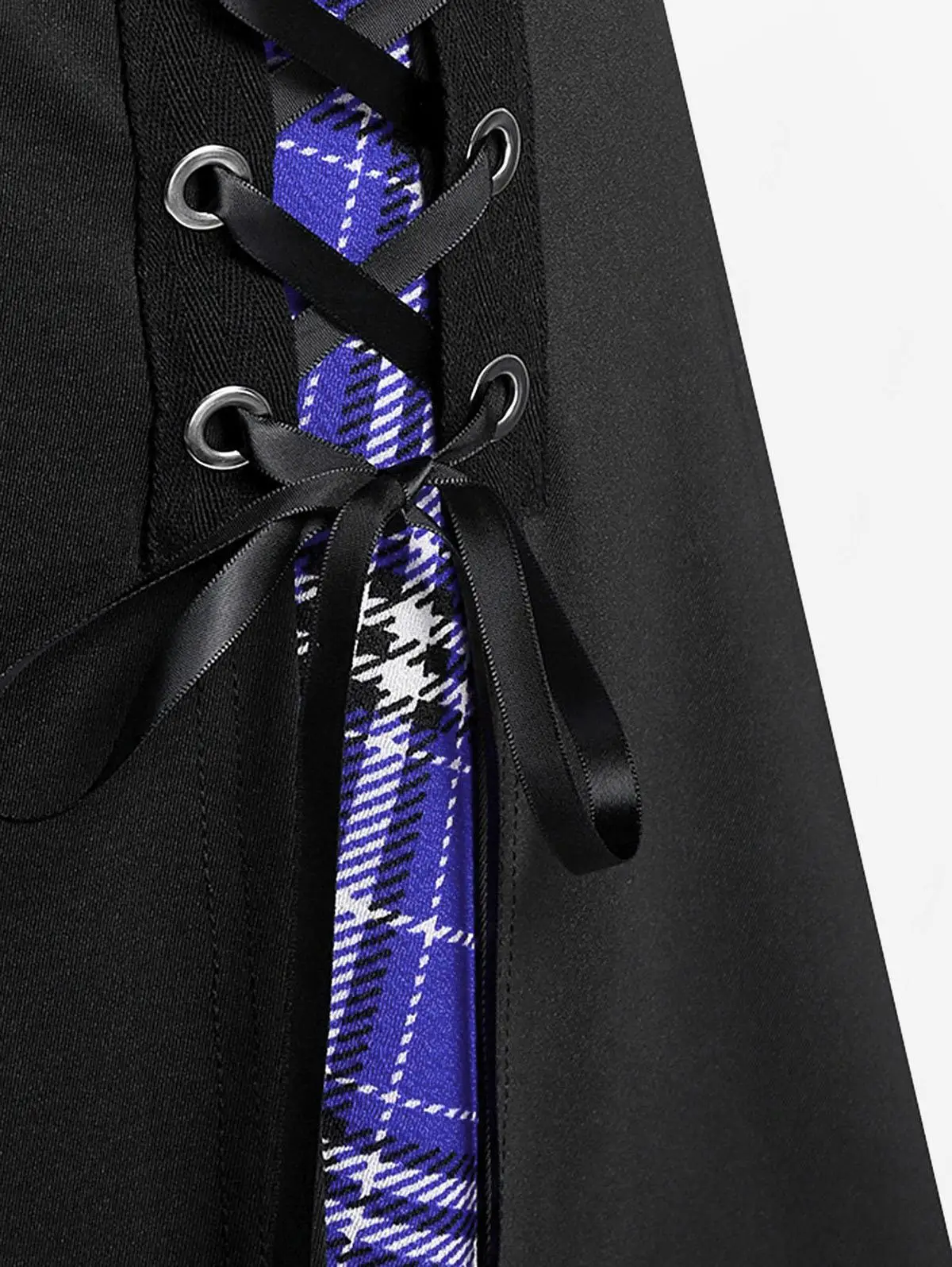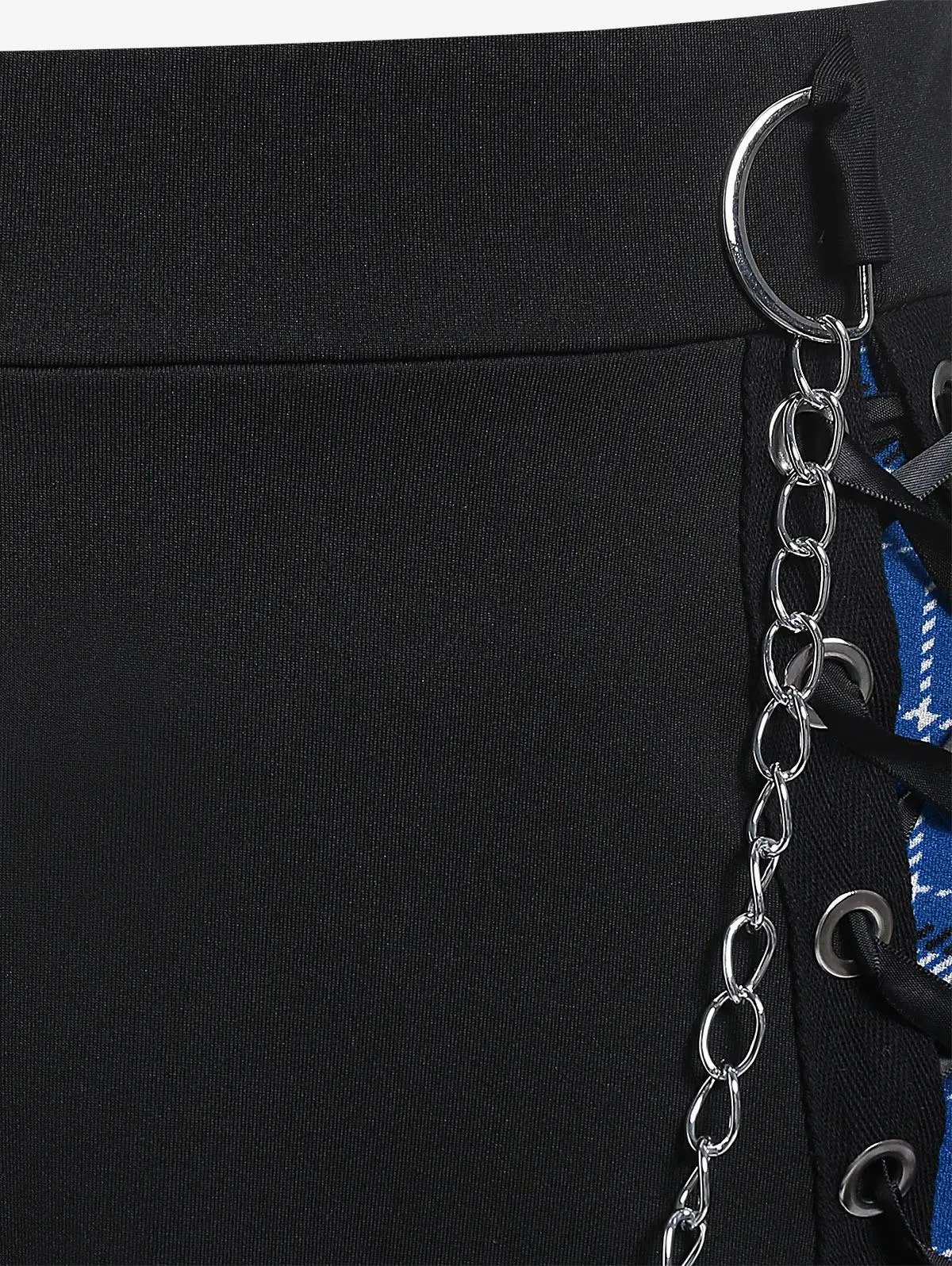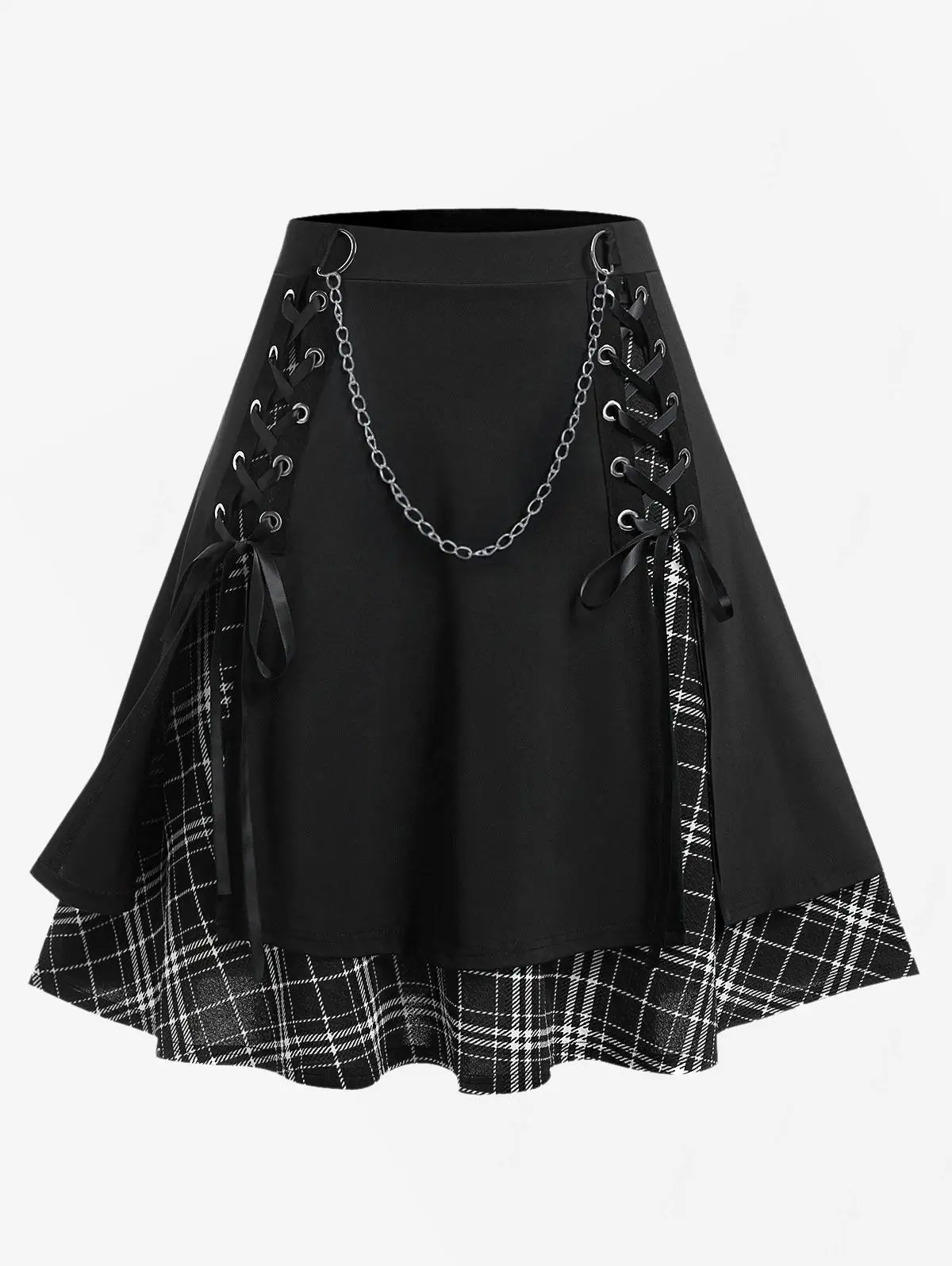 ROSEGAL Plus Size Women's Gothic Skirt Casual Plain Chain Detail High Waisted Stitching Plaid Pleated Layered Lace Up Skirts 5XL