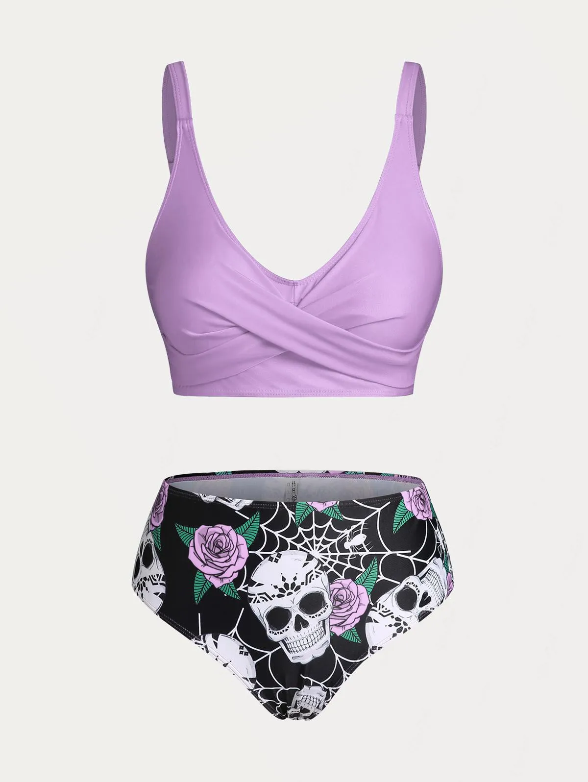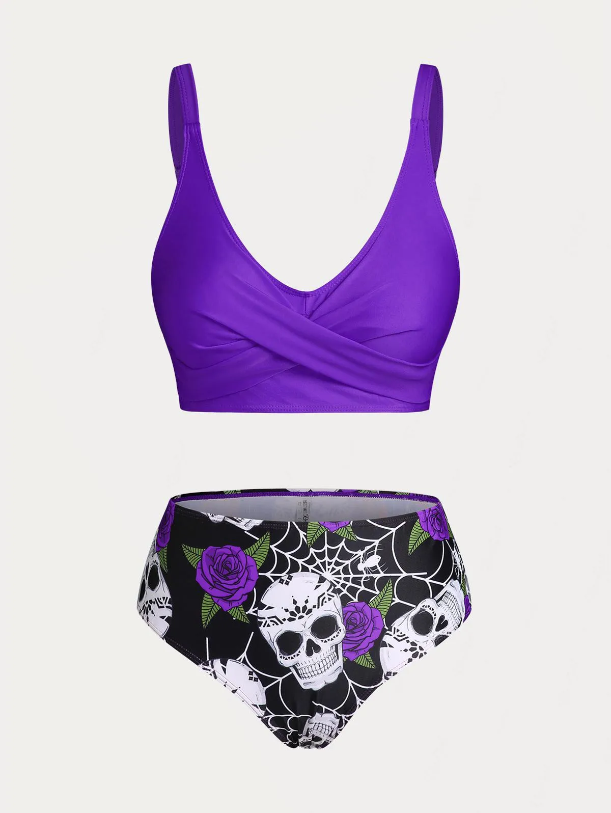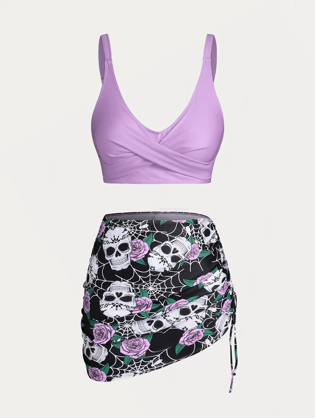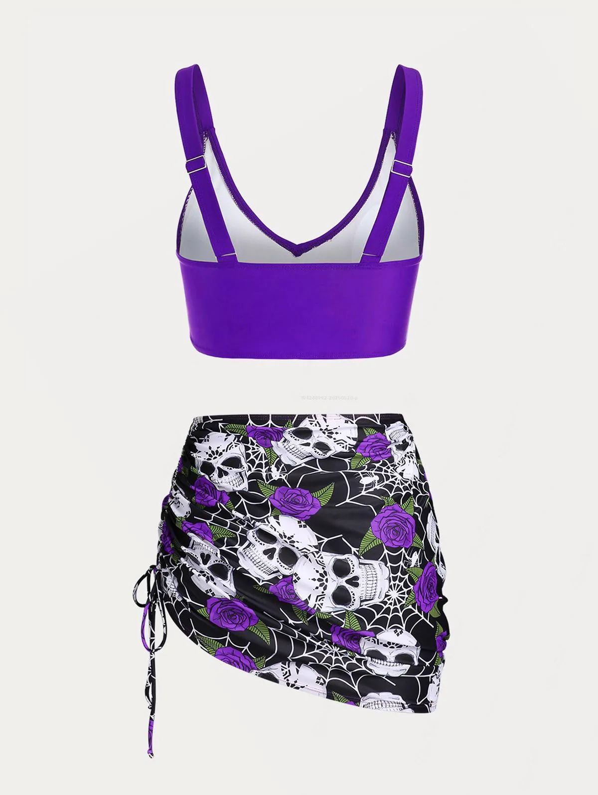 ROSEGAL Plus Size Women's Plus Size & Curve Skull Rose Print Crossover Three Piece Bikini Swimsuits