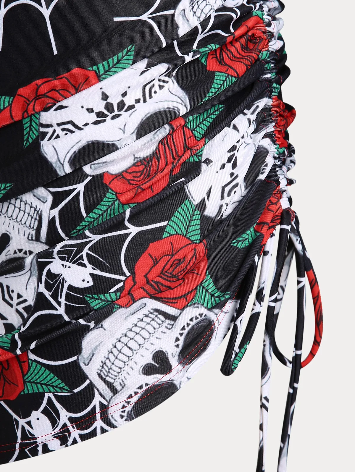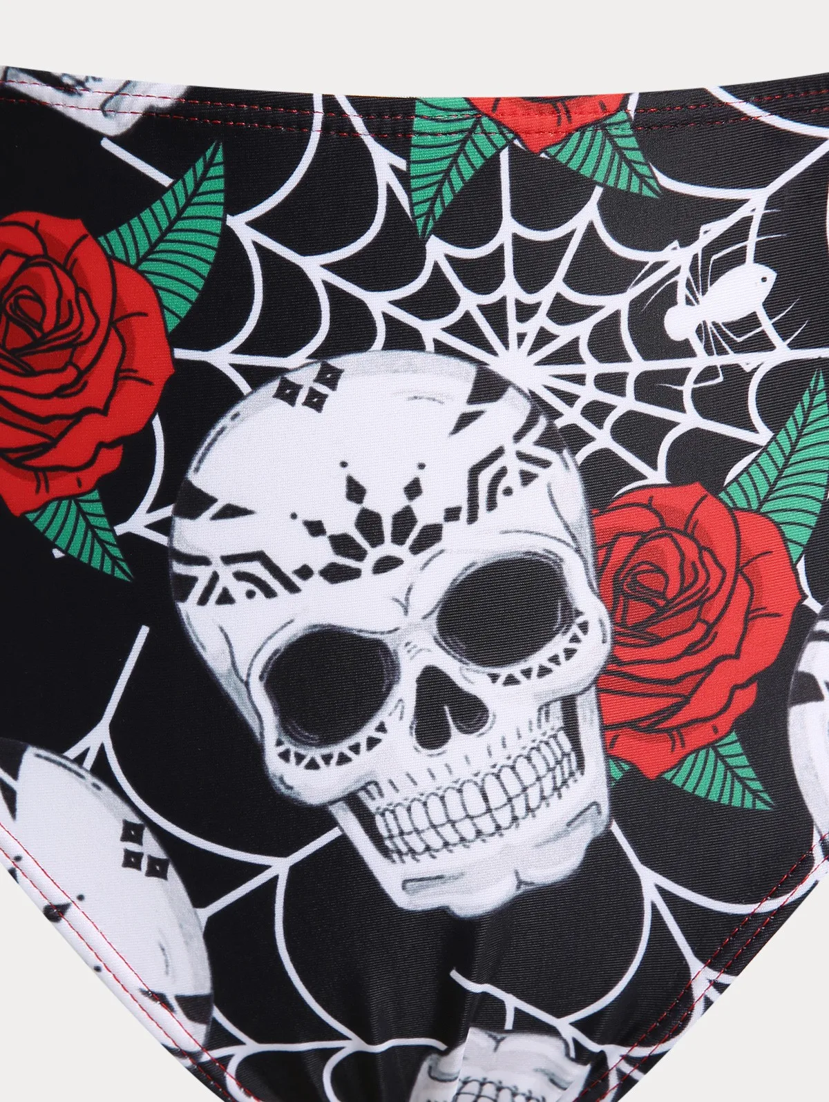 Features--The swim tank top has detachable pads for enough support and adjustable shoulder straps. The swim briefs is full back coverage design, match with skull rose print beach skirt with cinched ruched detail on one side for a gorgeous gothic look.