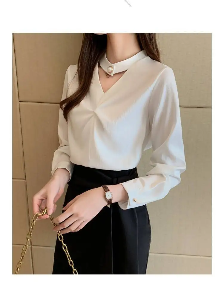 Satin Beading Halter V-Neck Woman Blouses 2022 Spring New Elegant Fashion Office Lady Long Sleeve Loose Commuter Shirts Female