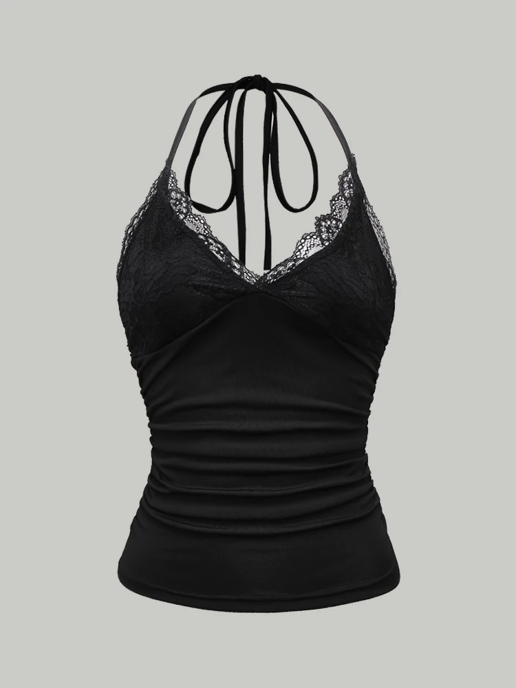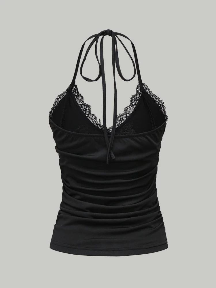 Sexy Lace V-neck Cropped Halter Tops For Women Summer 2025 Solid Color Casual Sleeveless Backless Ruched Tank Top Tee Shirt