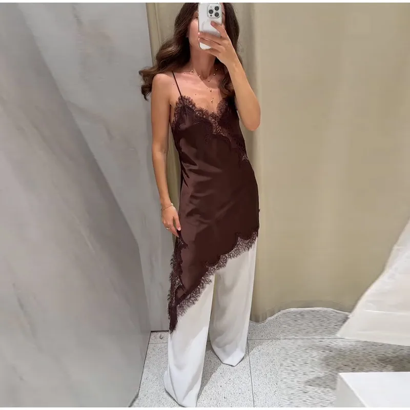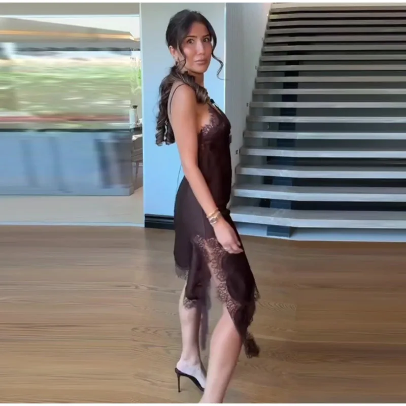 Sexy V-neck Sling Dress Women Fashion Sleeveless Lace Patchwork Irregular Mini Dresses 2025 Lady Summer Chic Casual Holiday Robe