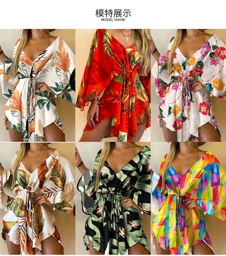 Sexy Women Mini Dress Floral Print V Neck 3/4 Bat Sleeve Lace Up Irregular Hem Casual Loose Beach Cover Up Dress Vestido Mujer