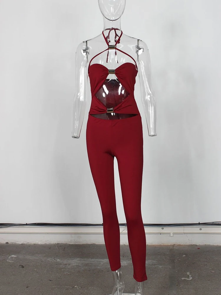 Sibybo Sleeveless Hollow Out Jumpsuit Women Fashion Metal Buckle Halter Backless Bodycon Rompers Overalls Sexy Party Clubwear