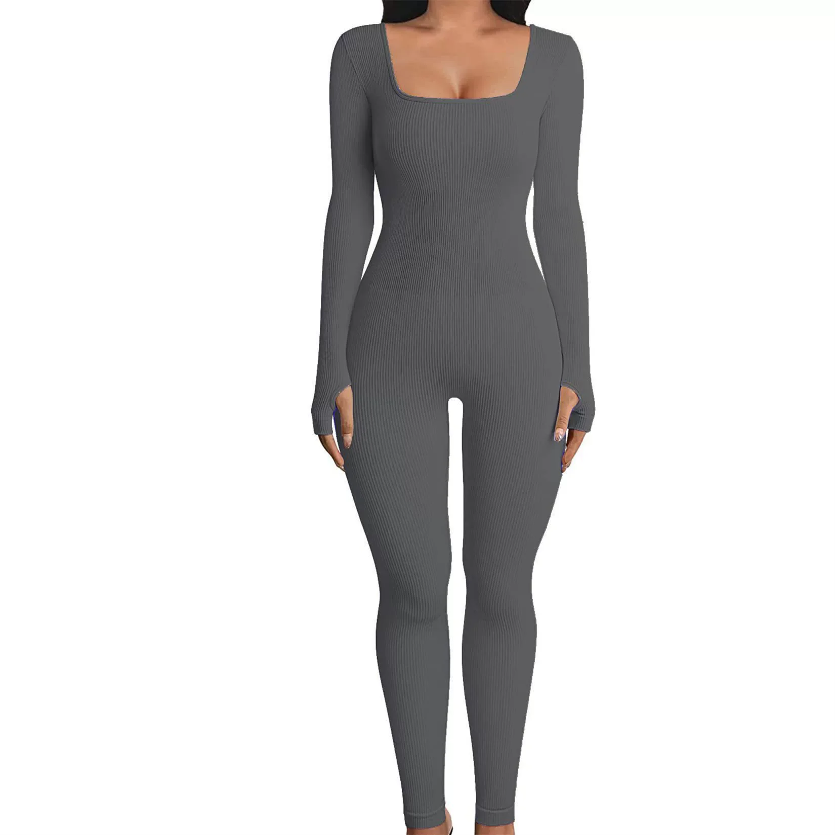 Solid Color Ribbed Yoga Jumpsuit, Seamless Slim Fit Long Sleeve Sports Bodysuit, Women's Activewear