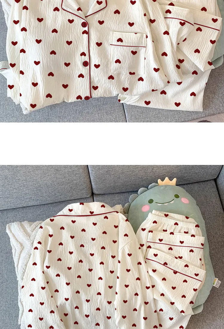 Spring and Autumn New Women's Pajamas Homewear Set Girls Gentle Wind Love Cardigan Pajamas Wrinkled Cloth Homewear Long-Sleeved