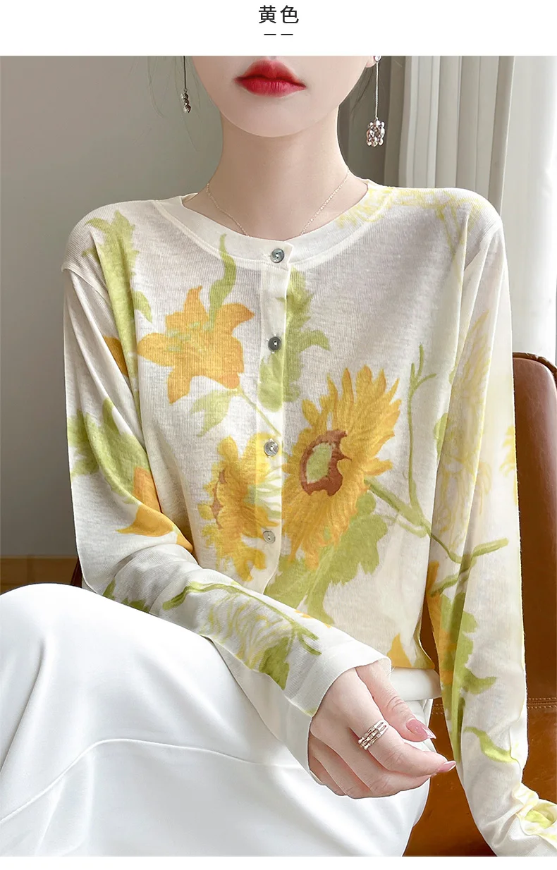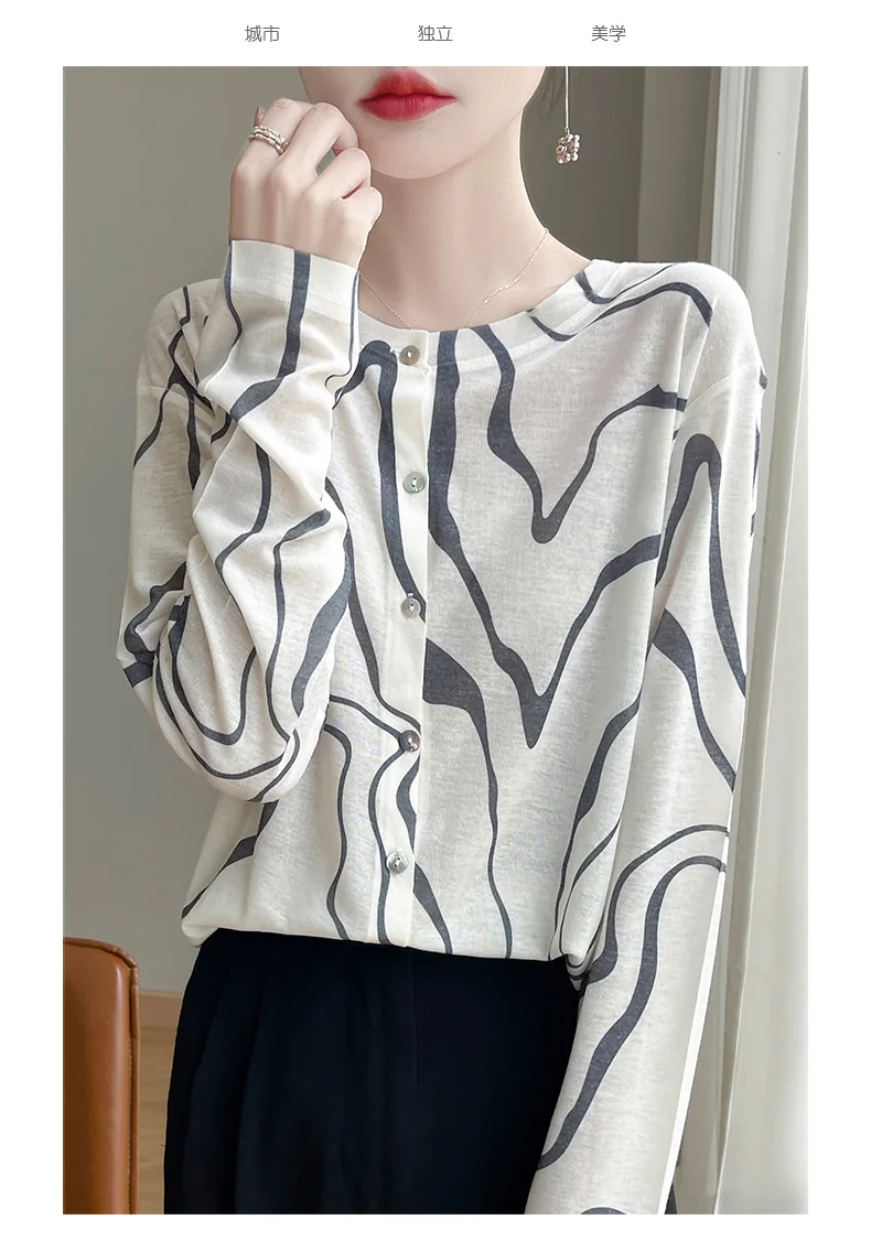 Spring And Summer New Lyocell Water-Soluble Wool Blended Round Neck Knit Cardigan Long Sleeve Feminine Sweater Printed Top