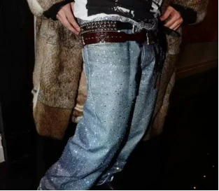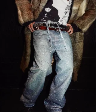 Street fashion retro design jeans Y2K rhinestone sequins retro blue loose men's and women's jeans high waist wide-leg trousers