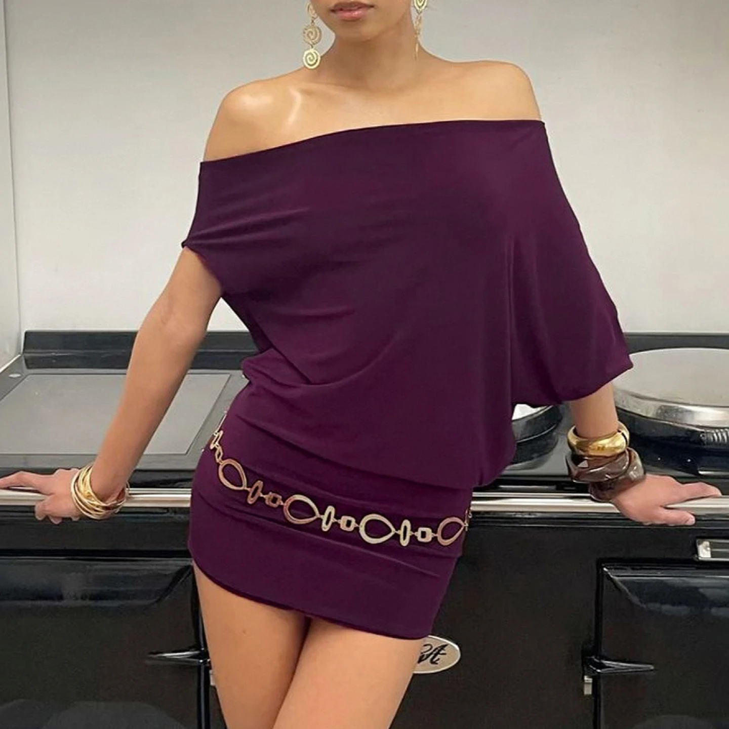 SUCHCUTE Bat Sleeve Wrap Dress Women One-Shoulder Solid Backless Bodycon Dress Evening Party Club Dress Y2K Sexy Outfits Summer