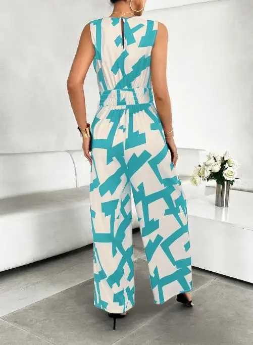 Summer Fashion Vacation Style Jumpsuits for Women Casual V Neck Sleeveless Color Blocking Lace Up High Waist Wide Leg Jumpsuit