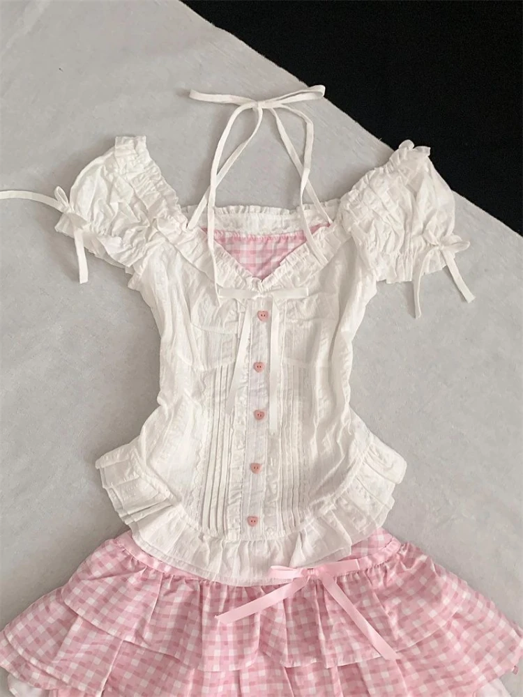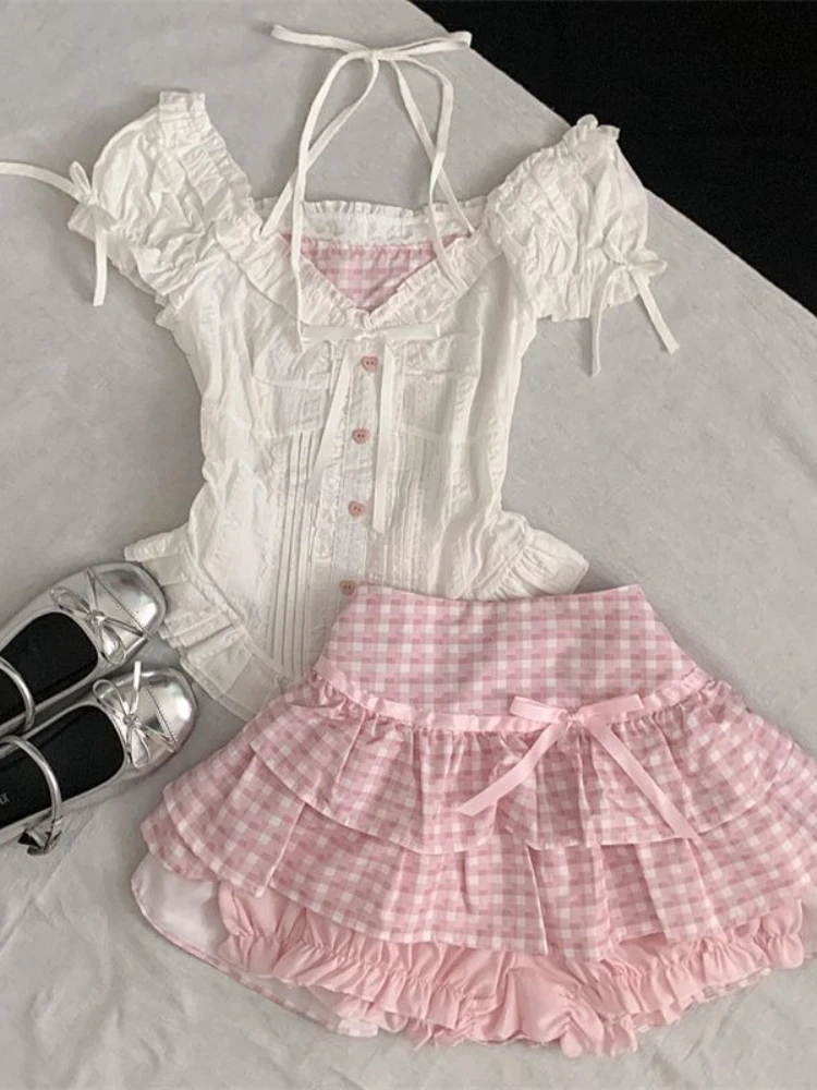 Summer Japanese Sweet Cute Women Outfits Bubble Sleeve Top + Pink Plaid Cake Skirt Harajuku Pure Desire Slim Two Piece Sets 2025