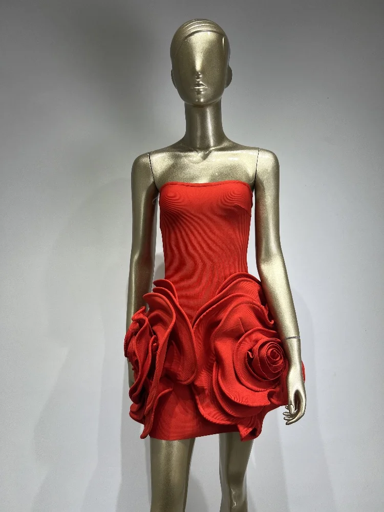 Summer New 2024 Women Sexy Strapless Crystal Flower Bodycon Bandage Dress Celebrity Elegant Birthday Mini Evening Party Dress