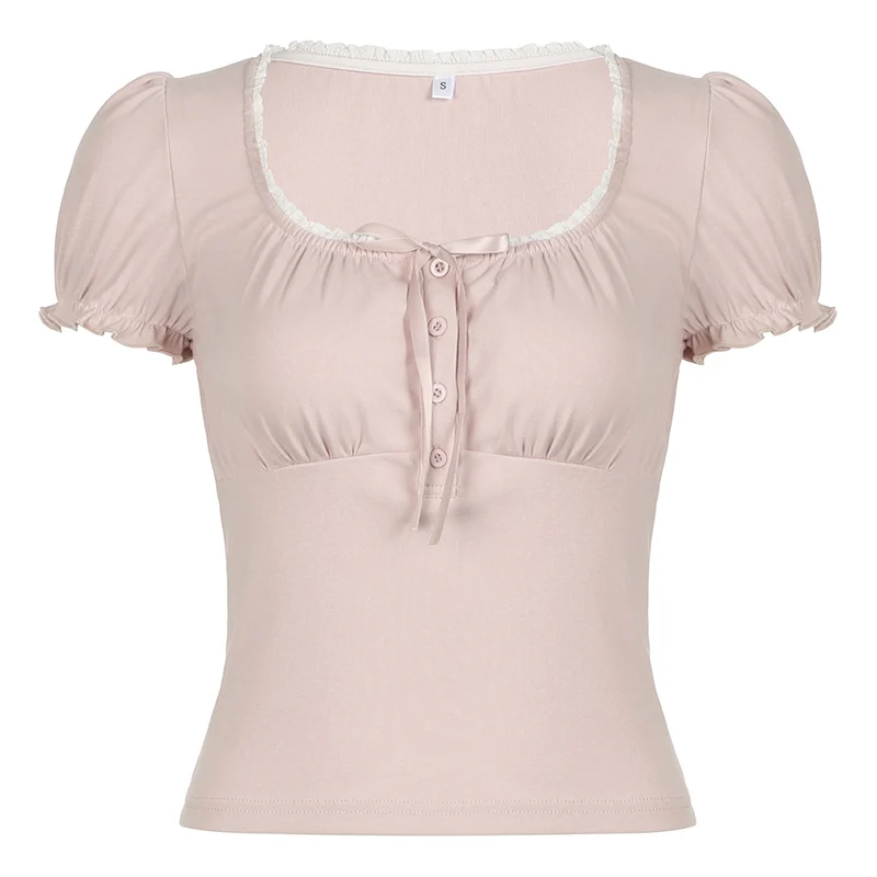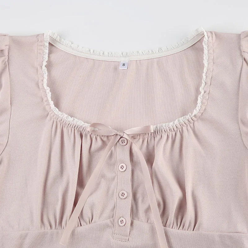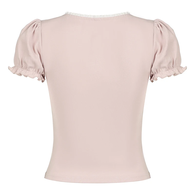 Sweet Button-up Top Women's Summer Cute Slim-fitting Contrast Lace Stitching Bow Square Collar T-shirts Y2K Korean Tees