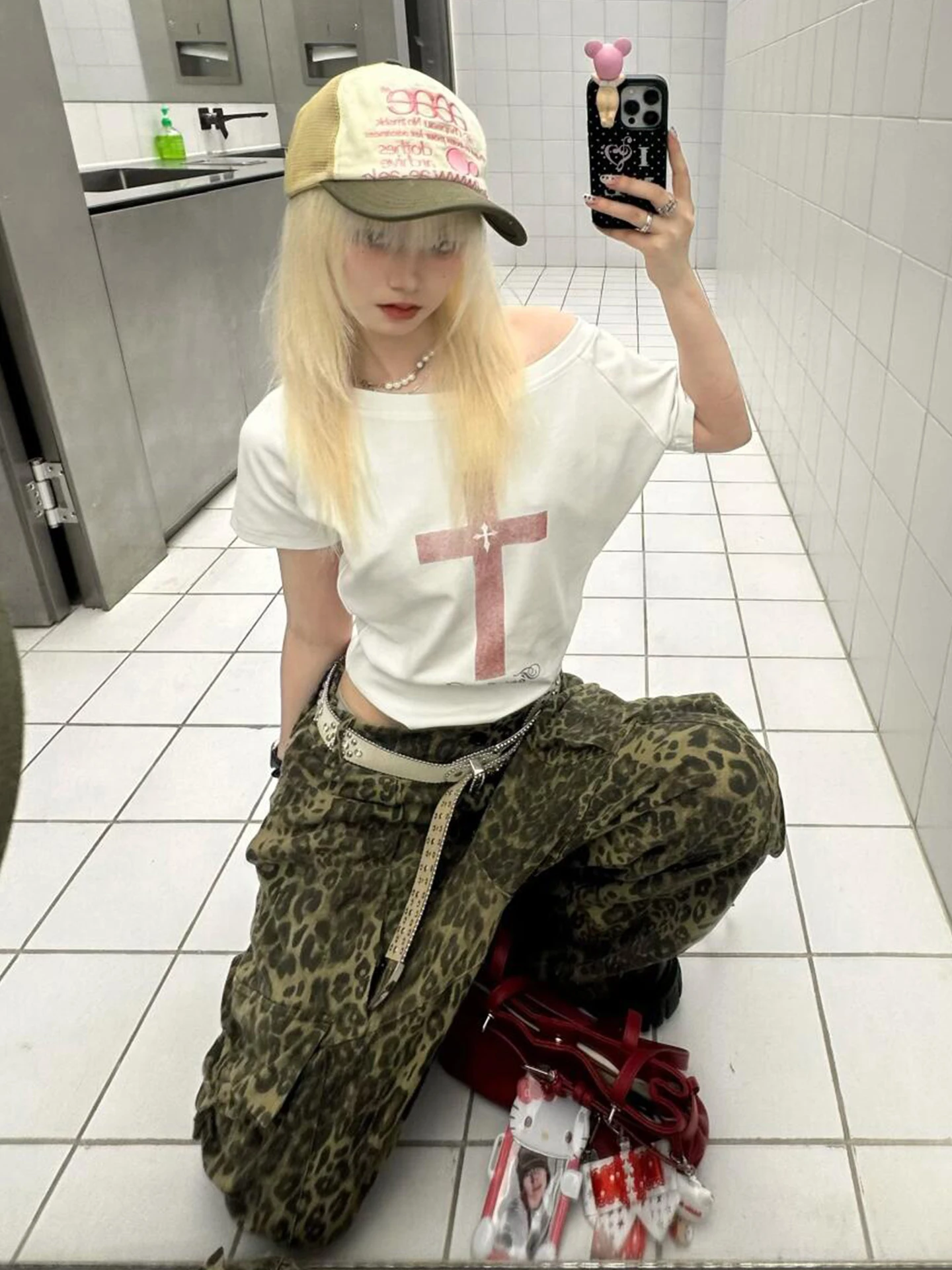 Tawaaiw Gothic Print Cross T Shirt Women Off Shoulder Short Sleeve Graphic Tee Female Clothing Korean Fashion 2000s Clothes Y2k