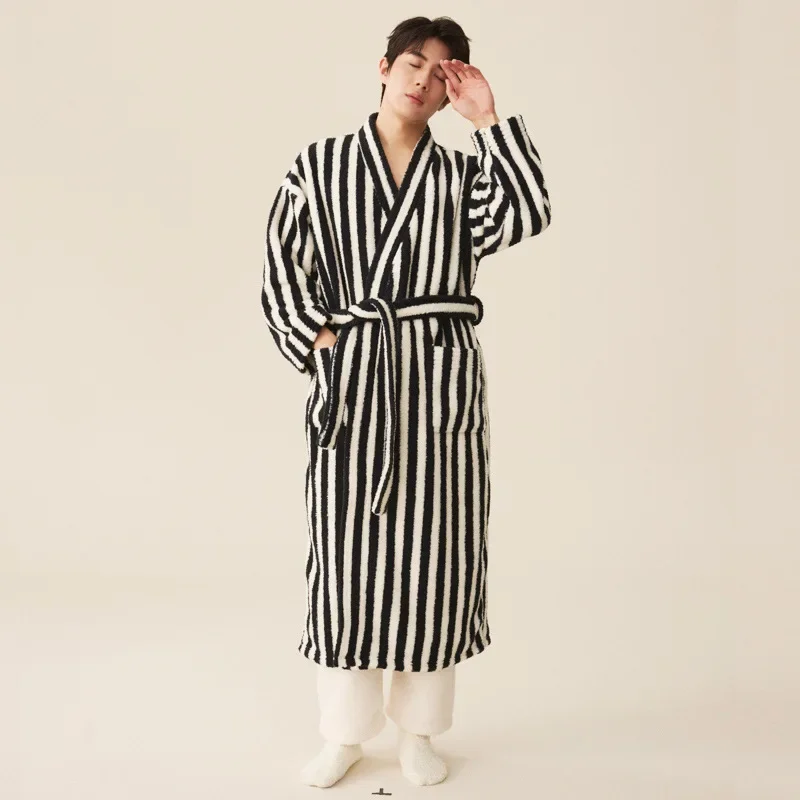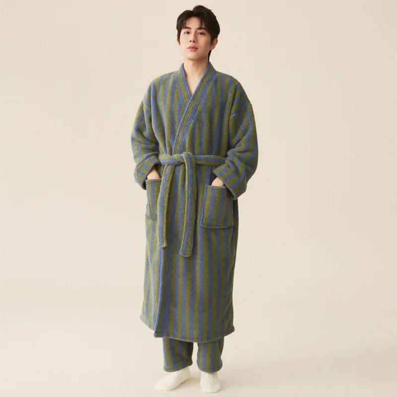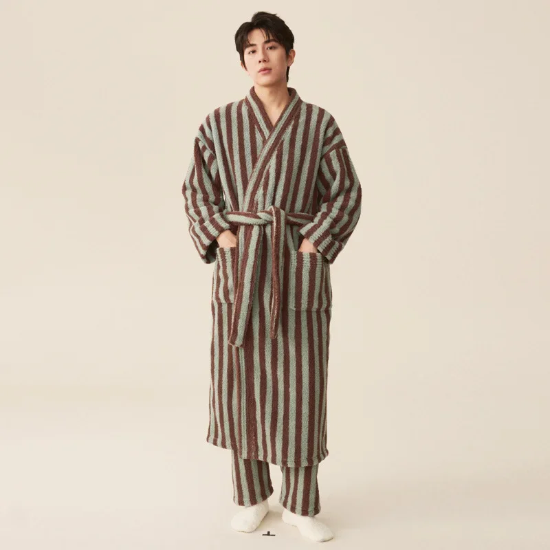 Thickened Flannel Robe Pants Pajamas Set Autumn Winter New Couple Coral Velvet Women Men Bathrobe Striped Lengthed Home Clothes